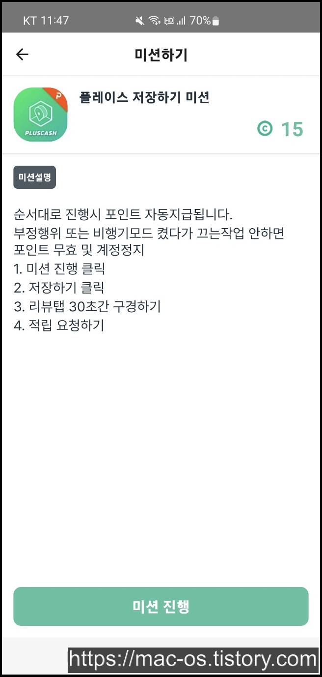 적립을 누르면 정답미션과 클릭미션을 볼 수 있다. 다른 앱과 비교해보면 포인트가 높은 편에 속한다. 내가 블로그를 하면서 여러 앱을 사용해봤지만 낮은 앱은 12포인트를 주는데 여긴 15포인트를 준다.