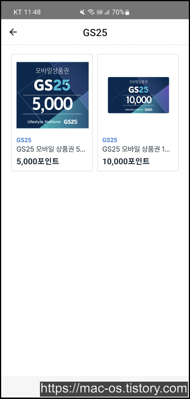 GS25 모바일 금액권이나 신세계 상품권, 스타벅스 기프트 카드 등이 있는데 1:1 비율로 교환하면 된다.
