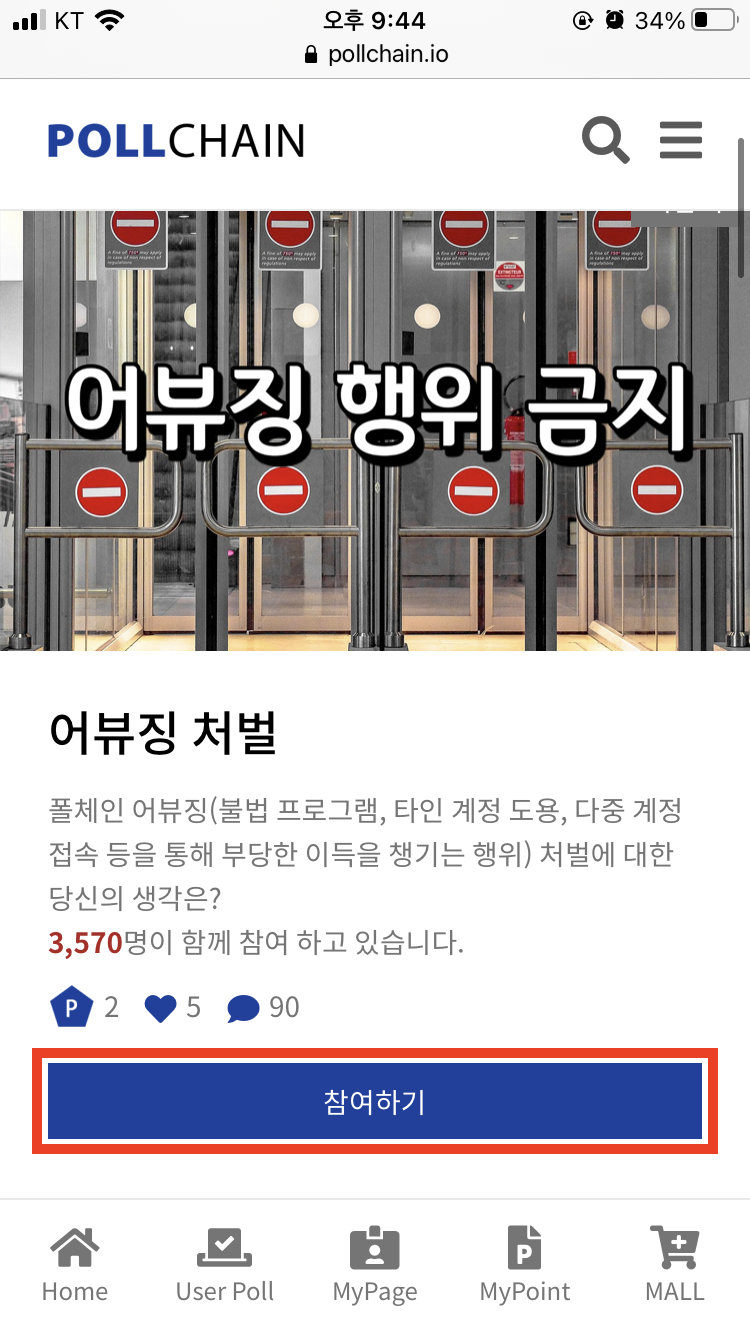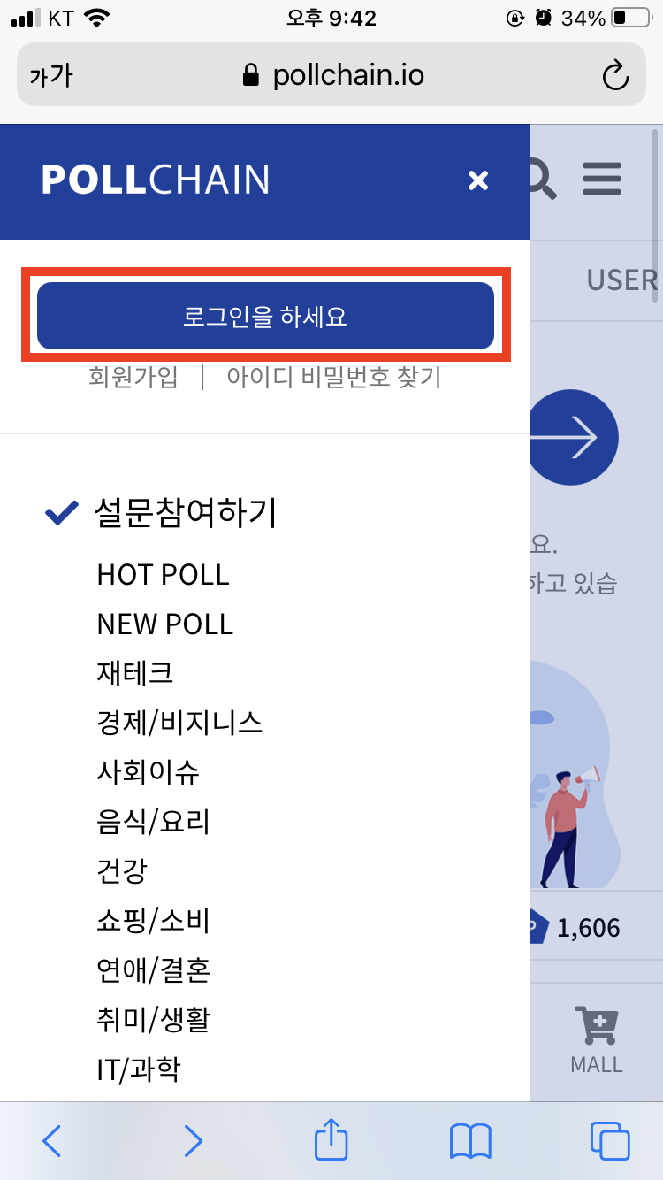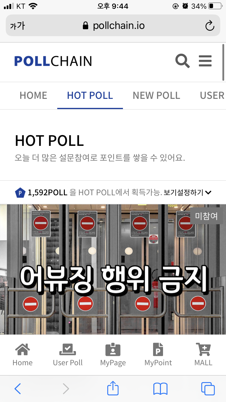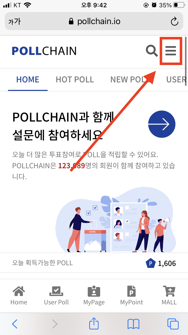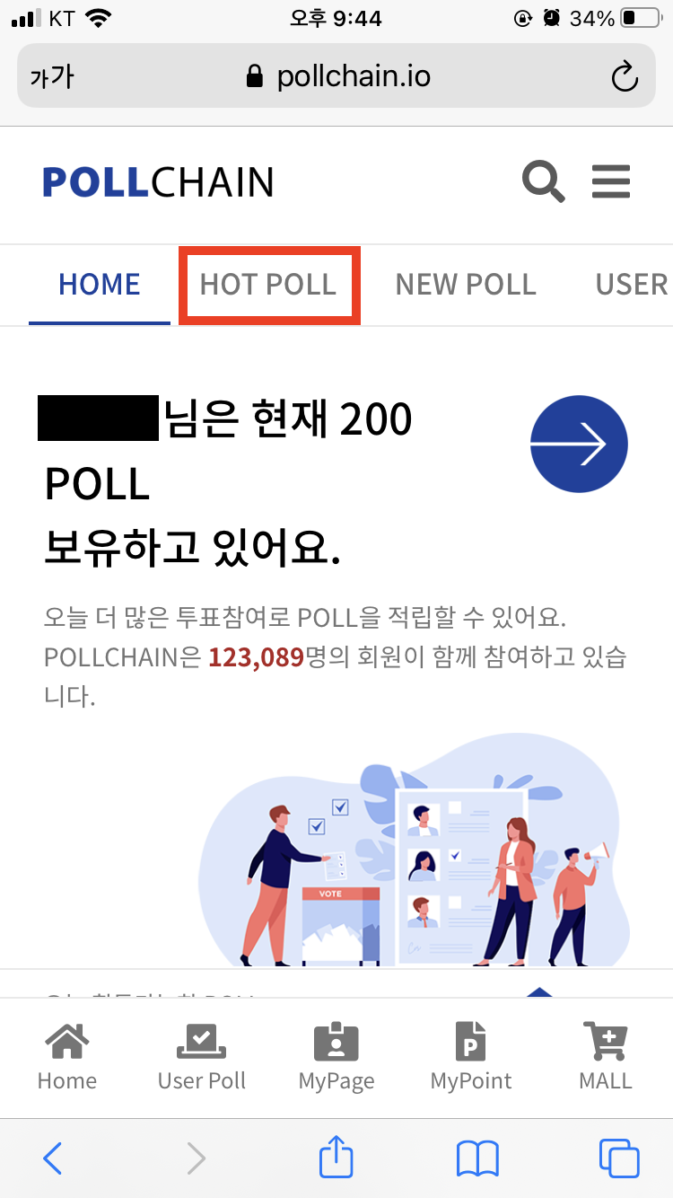 그리고 다시 폴체인 사이트에 돌아오셔서 상단의 'HOT POLL'을 터치해주세요.