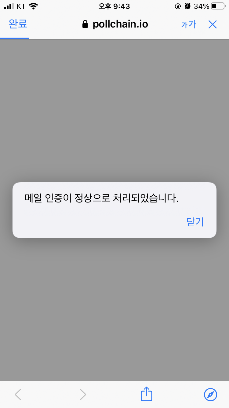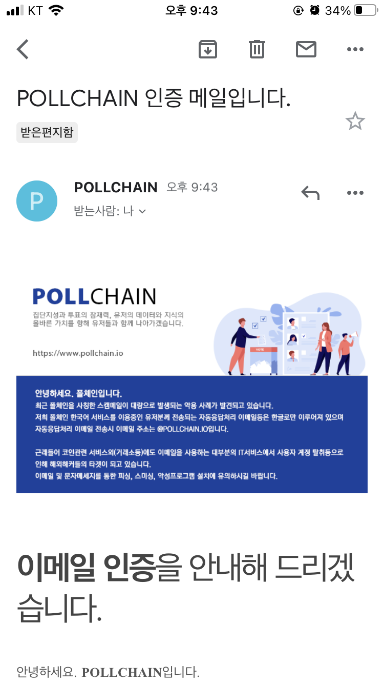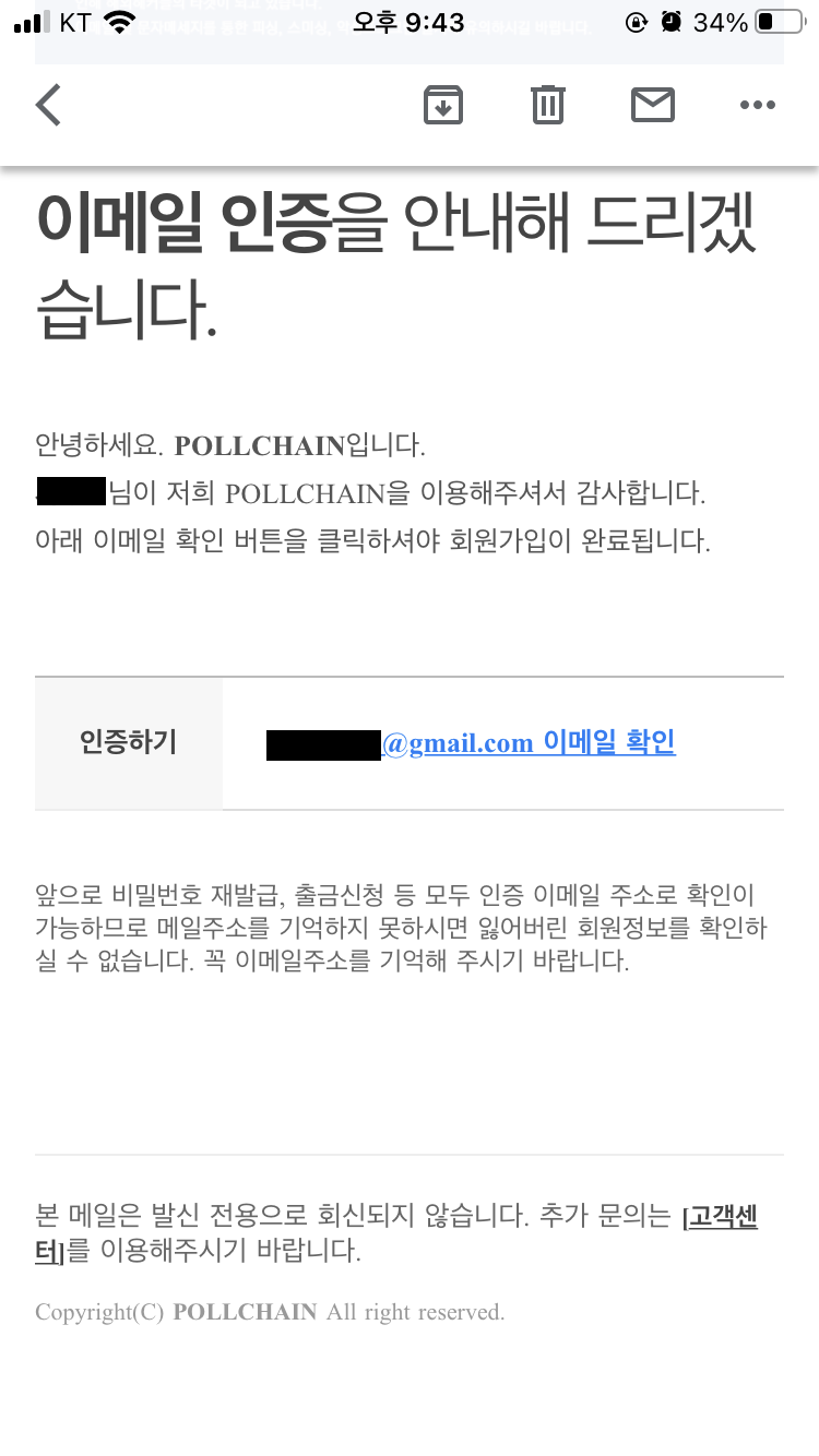 수신된 폴체인 메일에서 '이메일 확인' 글씨를 누르게 되면 이메일 인증이 완료됩니다.