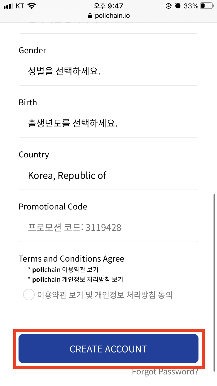 위에 있는 폴체인 초대링크를 누르셔서 회원가입하세요. 이메일 주소와 비밀번호, 이름, 성별, 프로모션 코드를 입력하고 아래에 'CREATE ACCOUNT'를 클릭하시면 됩니다.