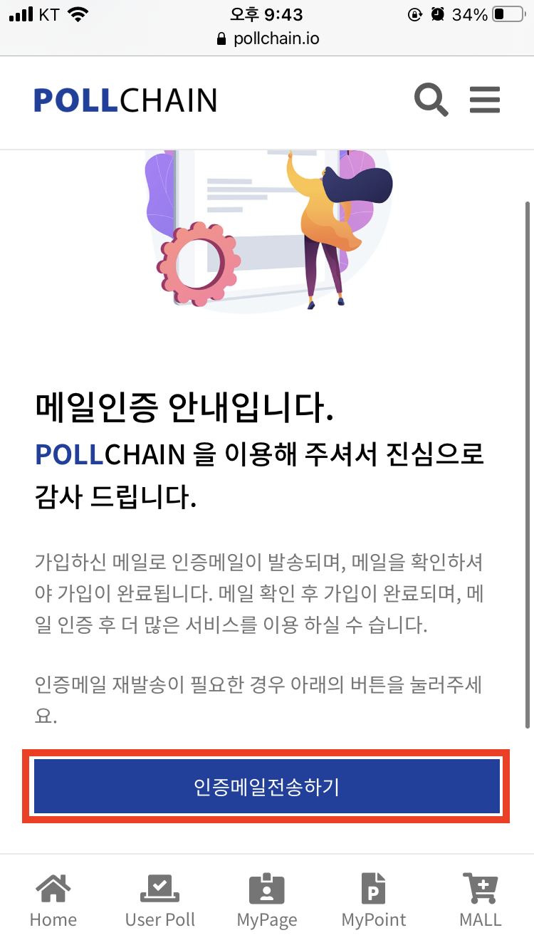 SMS 인증 후, 이메일 인증을 진행합니다. '인증메일전송하기'를 터치하고 이메일 인증을 완료해주세요.