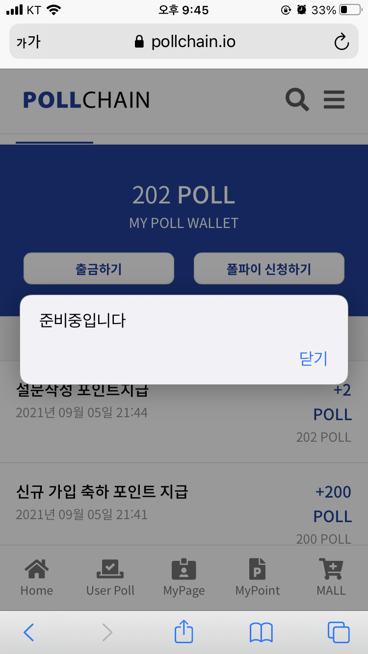 총 202POLL이 지급되었습니다. 아직 출금하기 기능은 둘 다 안되는 것 같았습니다.
