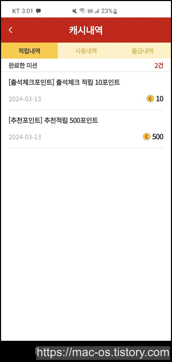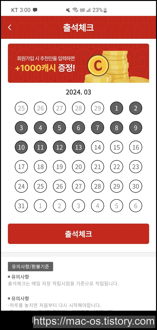 - 출석체크를 하면 매일 10원 적립이 가능하다.
