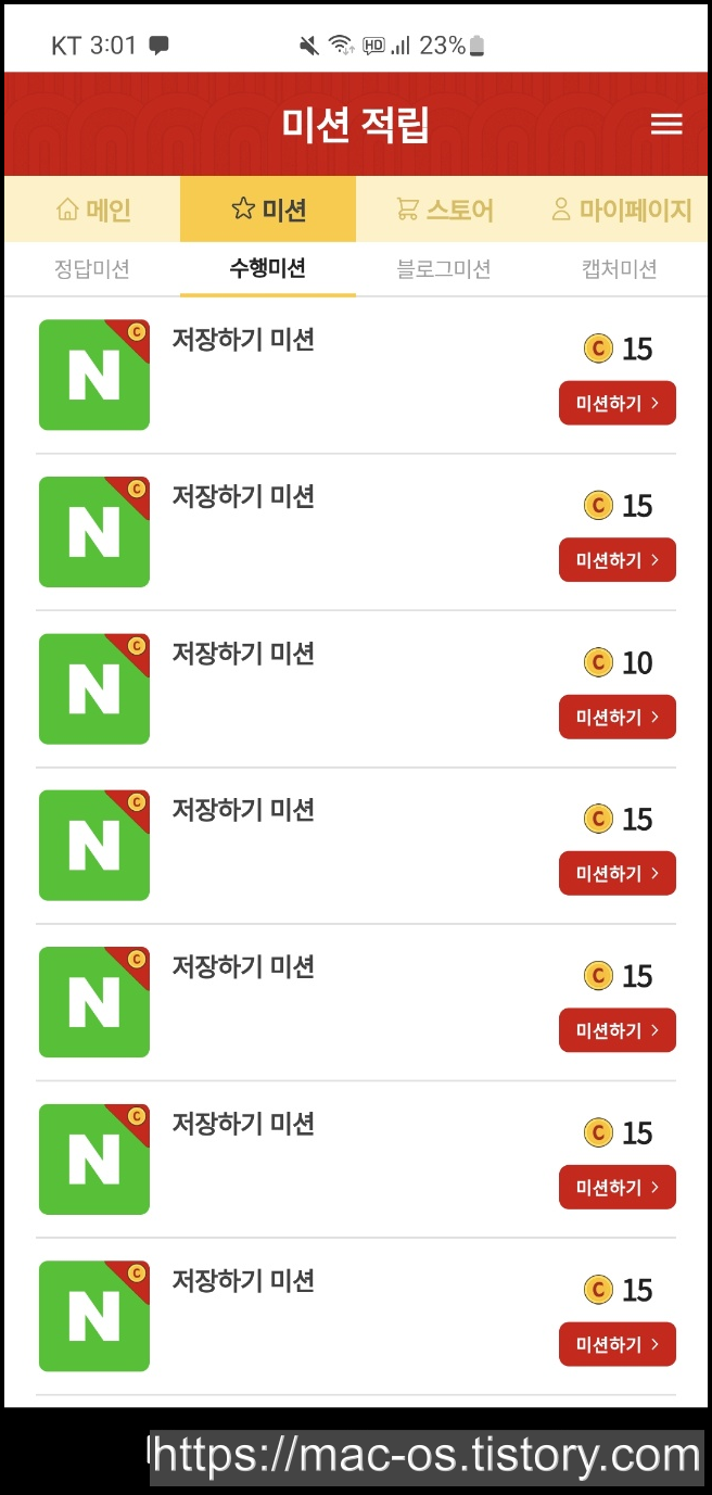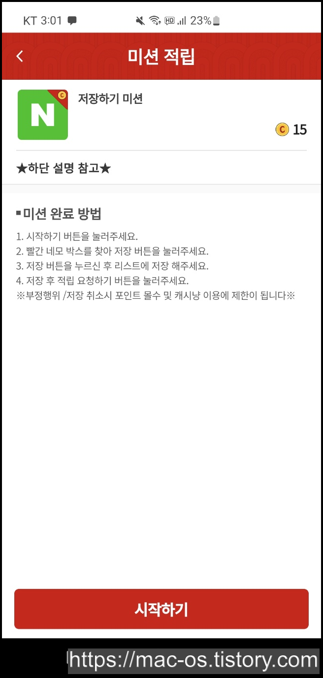 수행미션은 저장하기 미션이 많습니다. 저장하기 미션은 시작하기 버튼을 누르고 빨간 네모 박스를 찾아 저장 버튼을 누릅니다. 저장 버튼을 누른 후 리스트에 저장합니다. 저장 후 적립 요청하기 버튼을 누르면 15포인트가 적립됩니다.