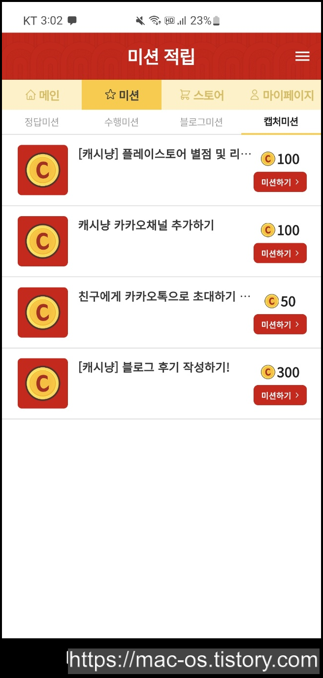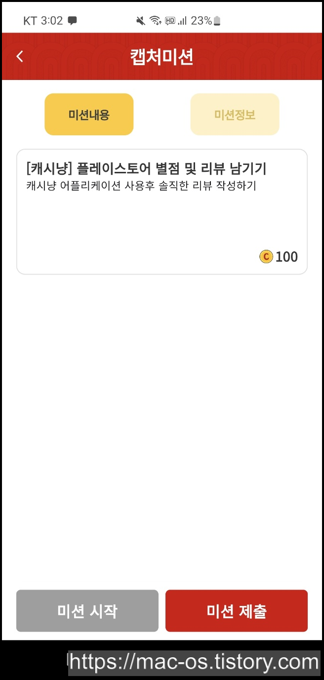 캡처미션은 캐시냥 구글 플레이 스토어 리뷰 작성이나 카카오채널 추가하기, 친구에게 카카오톡으로 초대하기, 블로그 후기 작성하기 등의 미션이 있습니다. 리뷰 작성 후 미션 제출 버튼을 누르면 100포인트가 적립됩니다.