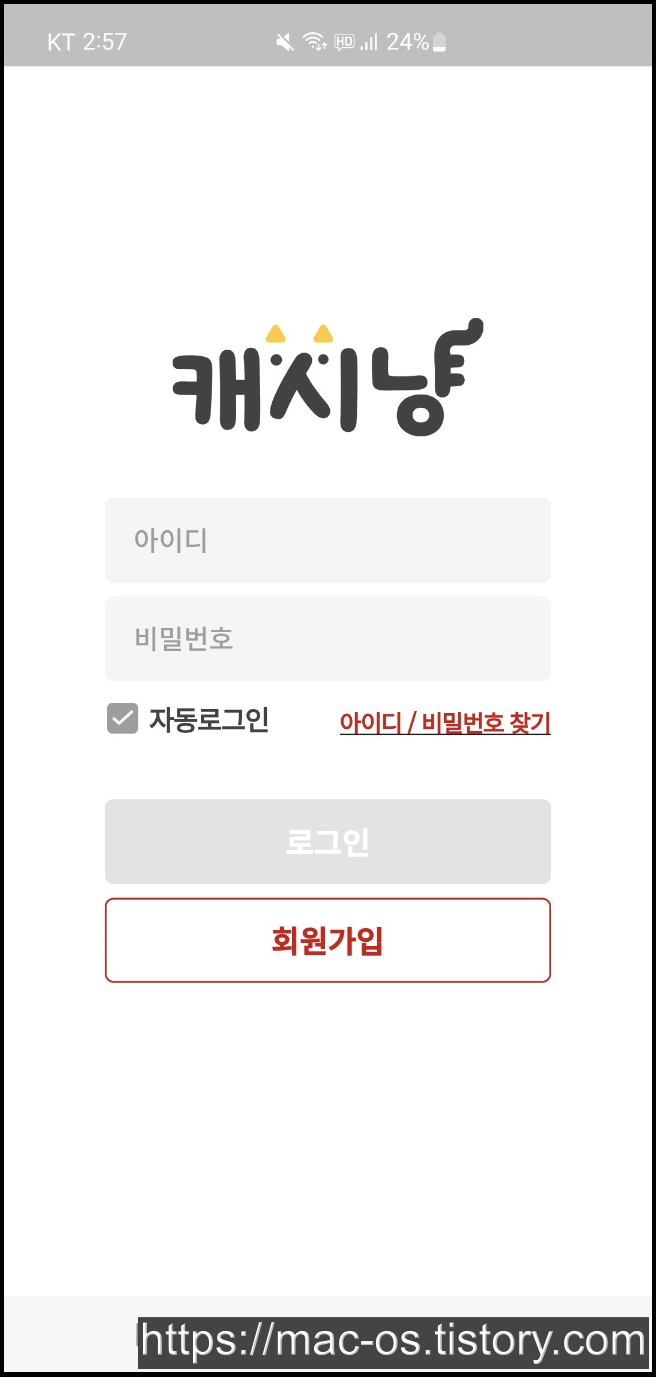 캐시냥은 구글 플레이 스토어에서만 설치할 수 있습니다. 로그인 페이지에서 회원가입을 진행합니다.