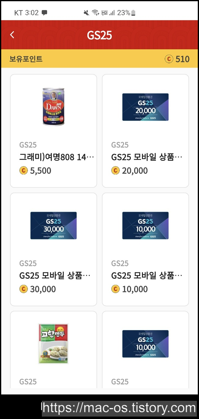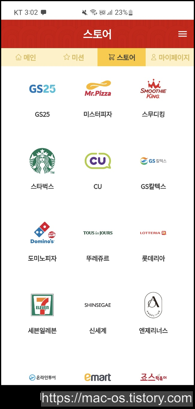 스토어에서 GS25, 미스터피자, 스무디킹, 스타벅스 등 포인트를 사용해 1:1 비율로 기프티콘을 구매할 수 있습니다.