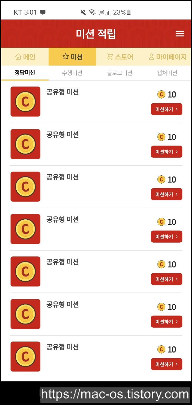 포인트는 미션에 참여하면 얻을 수 있고, 미션은 정답미션, 수행미션, 블로그미션, 캡처미션 4가지 종류가 있습니다. 정답미션에서 공유형 미션은 미션 설명을 잘 본 다음 미션진행을 눌러 진행합니다.