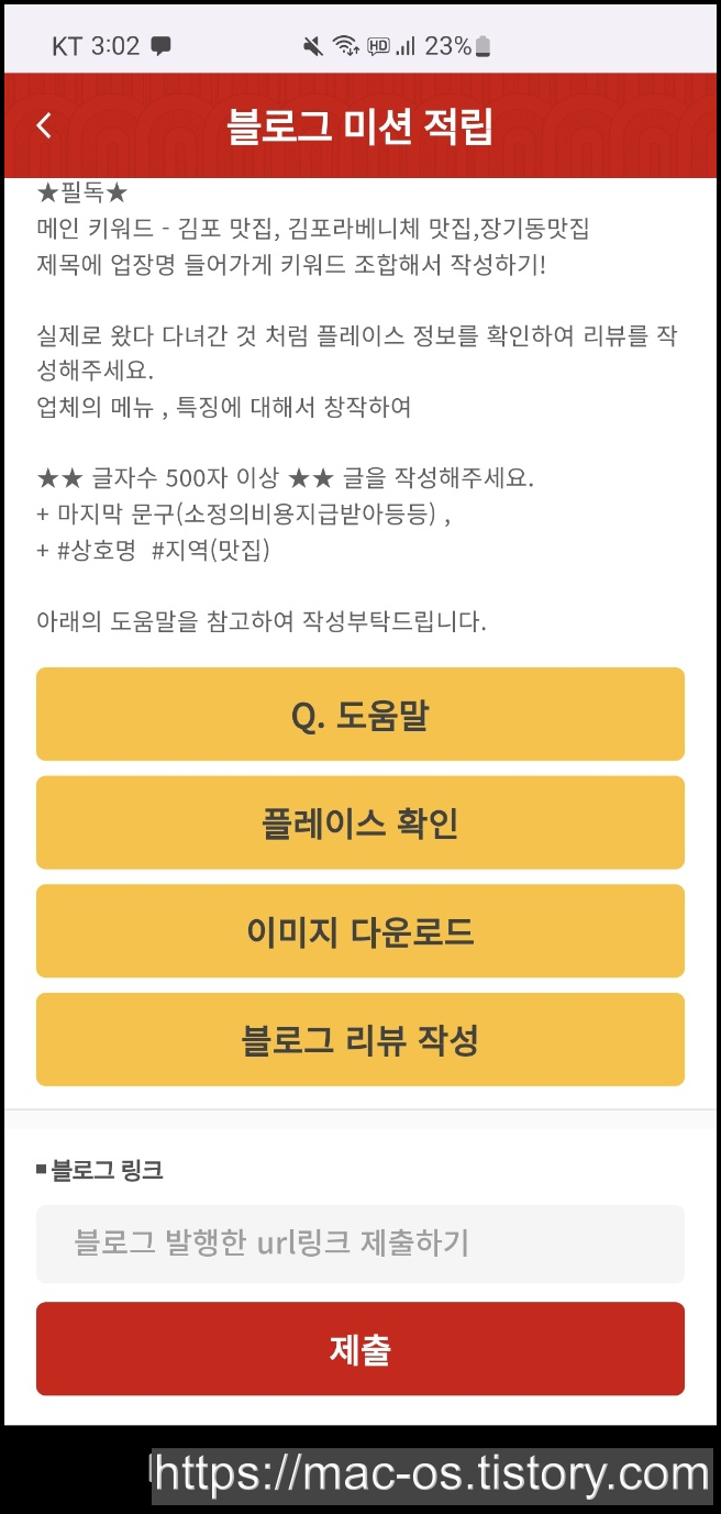 제목과 이미지, 네이버 플레이스 장소삽입, 메인 키워드, 글자수, 해시태그 등 글을 작성할 때 조건이 있으니 꼼꼼히 확인할 필요가 있습니다. 이를 확인하고 글을 작성한 다음 블로그 발행 url 링크를 제출하면 300포인트가 적립됩니다.