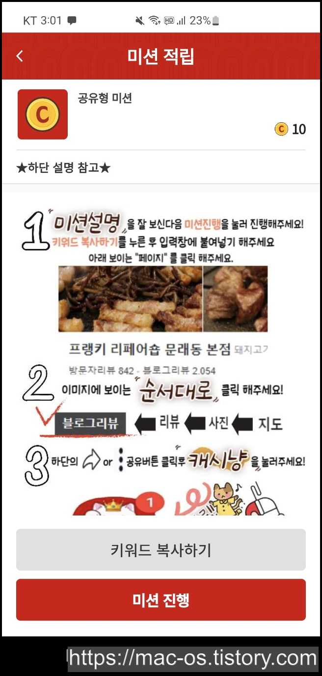 그리고 키워드 복사하기를 누른 후 입력창에 붙여넣기 합니다. 아래 보이는 페이지를 클릭하고 이미지에 보이는 순서대로 지도, 사진, 리뷰, 블로그 리뷰를 누르면 됩니다. 하단의 화살표나 공유 버튼을 누른 후 캐시냥을 누르면 미션이 완료되고 10포인트가 적립됩니다.