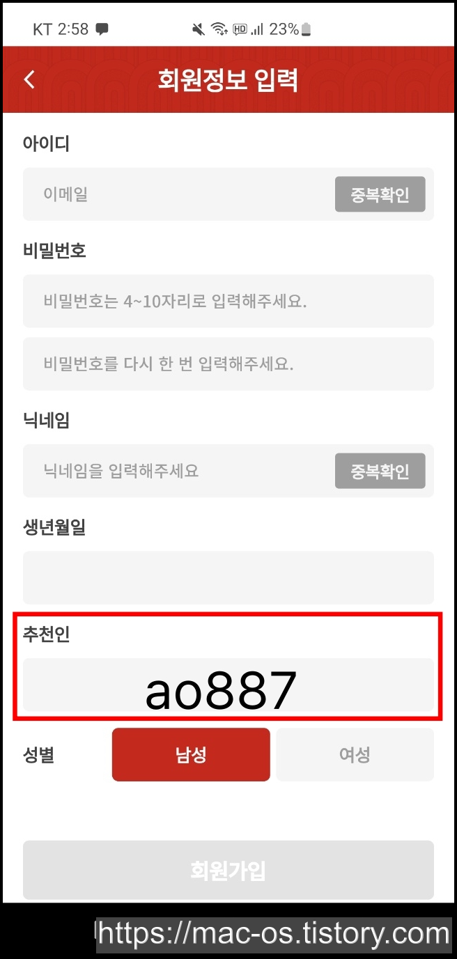회원정보 입력 페이지에서 추천인을 입력하면 500포인트를 받고 시작할 수 있습니다. 캐시냥 추천인은 ao887을 입력하시면 됩니다.