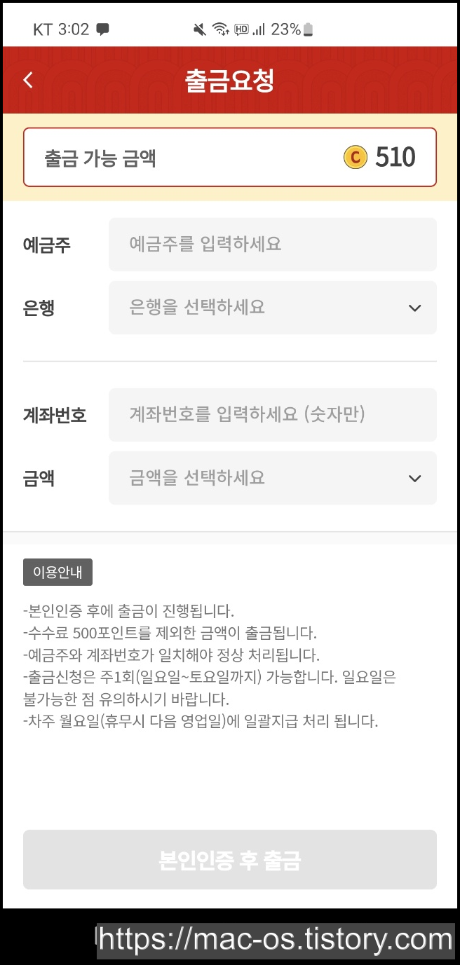 마이페이지에서 출금요청 버튼을 눌러 현금으로 받는 것도 가능합니다. 본인인증 후에 출금이 진행되고 수수료 500포인트를 제외한 금액이 출급됩니다. 예금주와 계좌번호가 일치해야 정상 처리되며 출금신청은 주 1회만 가능합니다. 차주 월요일에 일괄지급 처리됩니다.