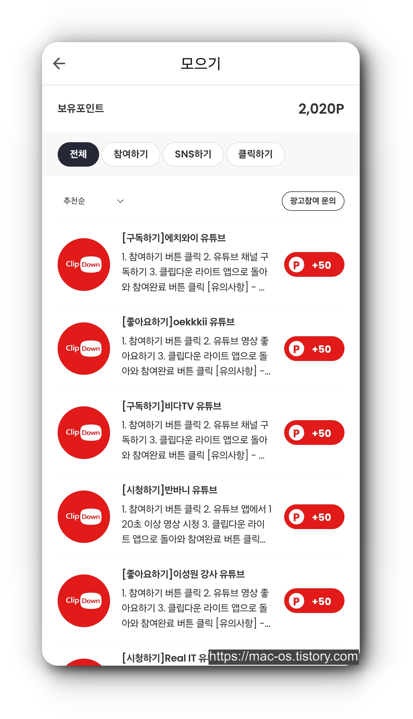 포인트 모으기 페이지로 이동하면 유튜브 구독, 좋아요, 시청, 앱설치, 인스타 팔로우 등 여러 광고에 참여하고 보상으로 클립다운 포인트를 받을 수 있습니다.