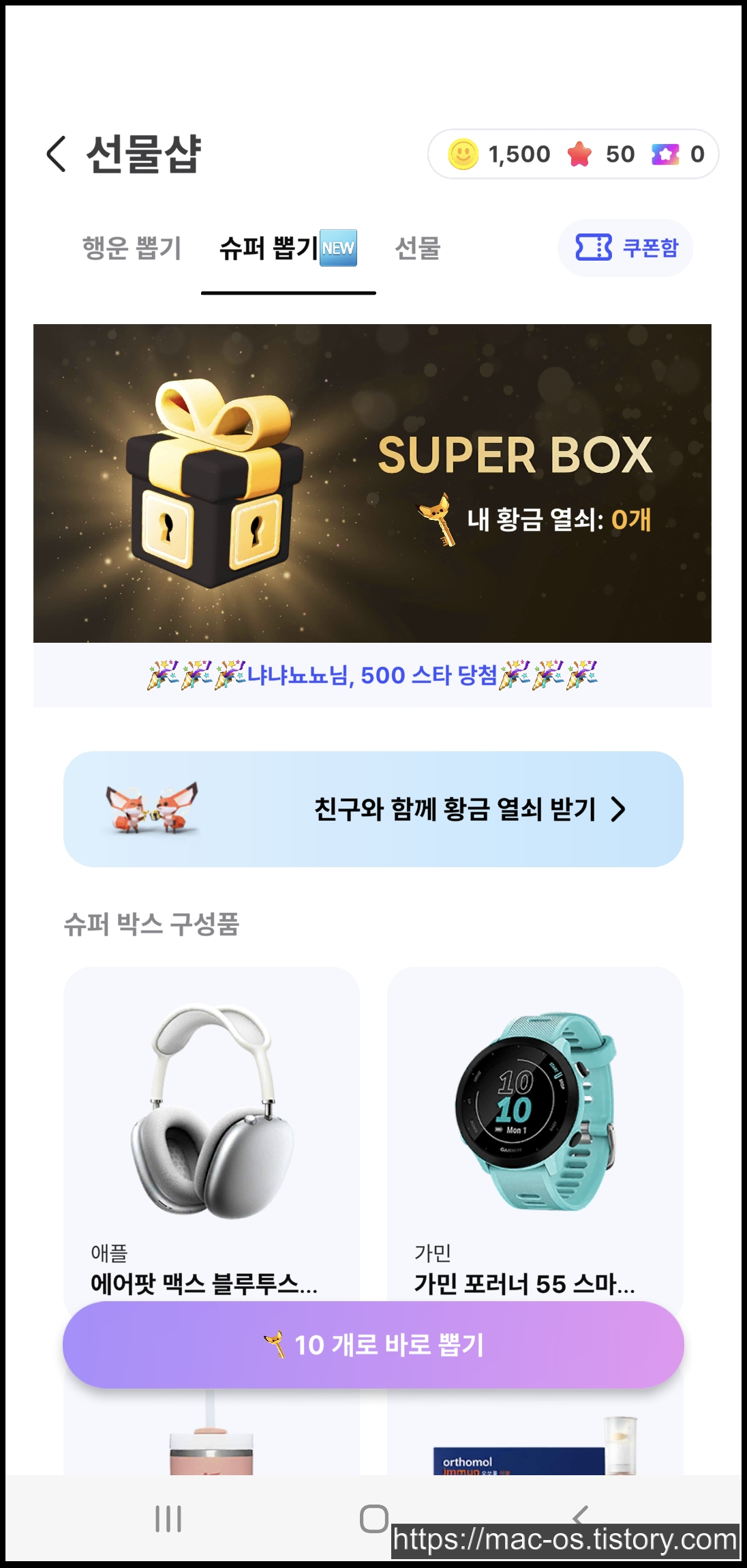 친구에게 초대받아 얻은 황금 열쇠 30개는 선물샵의 슈퍼 뽑기에서 뽑기를 하는 데 사용할 수 있습니다. 뽑기 1번에 황금 열쇠 10개가 소모되고, 애플 에어팟 맥스 블루투스, 가민 가민 포러너 55 스마트워치 등 다양한 경품을 얻을 수 있습니다.