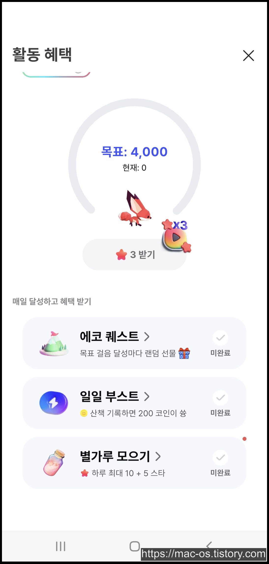 에코 퀘스트는 목표 걸음을 달성할 때마다 랜덤으로 선물을 주는 퀘스트입니다. 1천, 3천, 6천 걸음을 걸을 때마다 선물이 쌓이고 선물을 개봉하면 광고 영상을 시청하게 됩니다. 광고를 다 보고 나면 선물 박스에서 최대 100스타가 등장합니다.