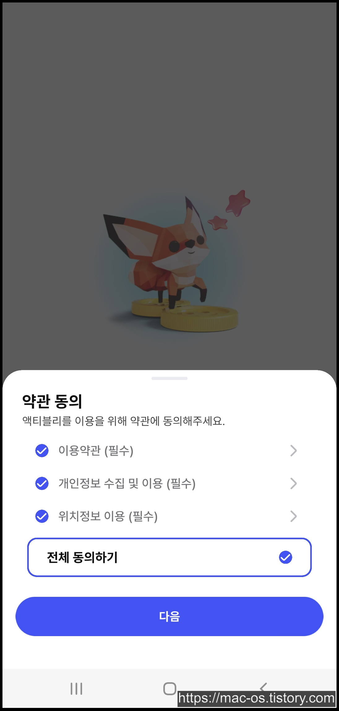액티블리는 구글 플레이 스토어와 애플 앱스토어에서 설치할 수 있습니다. 앱을 설치하고 실행한 다음 시작하기 버튼을 터치합니다.