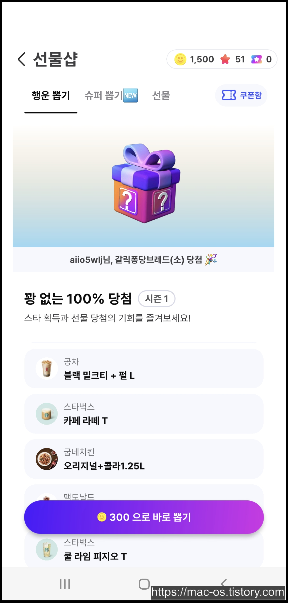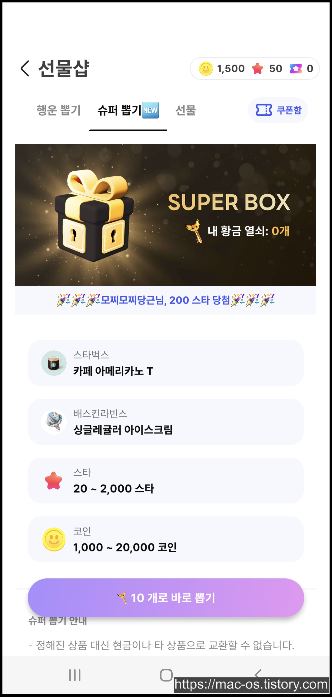 일일 부스트를 통해 얻은 코인은 선물샵의 행운 뽑기에 사용됩니다. 행운 뽑기에서는 공차 블랙 밀크티, 스타벅스 카페라떼 등 기프티콘을 얻을 수 있고, 운이 없다면 소량의 스타가 등장합니다.