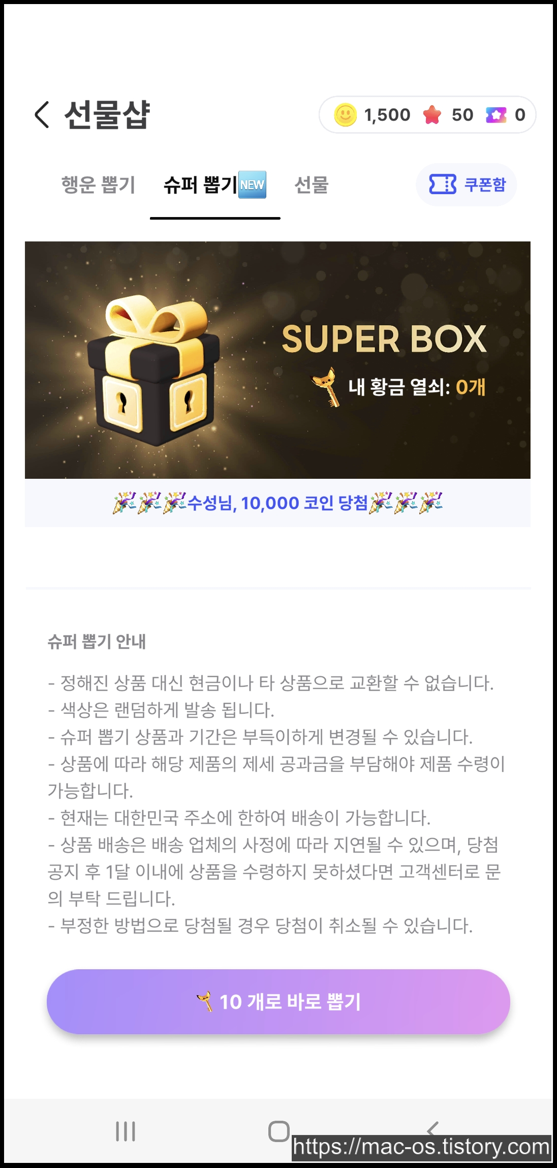 - 황금 열쇠 10개를 사용해 슈퍼 뽑기 1회를 할 수 있는데, 에어팟 맥스, 스마트 워치 등 고가의 경품이 뽑기 상품으로 등장한다.