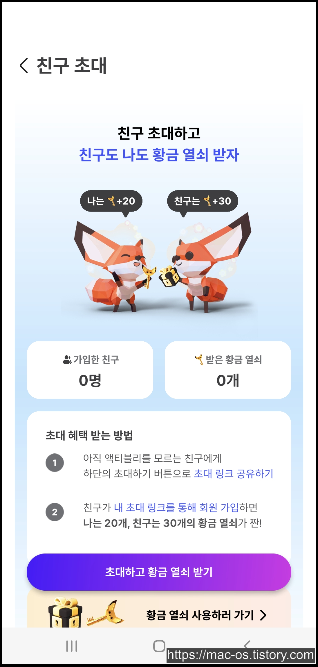참고로 앱을 처음 설치할 때, 위에 있는 친구초대 링크를 누르면 구글 플레이 스토어로 이동하게 되는데 이렇게 링크를 통해 가입하면 황금 열쇠 30개를 받을 수 있습니다.