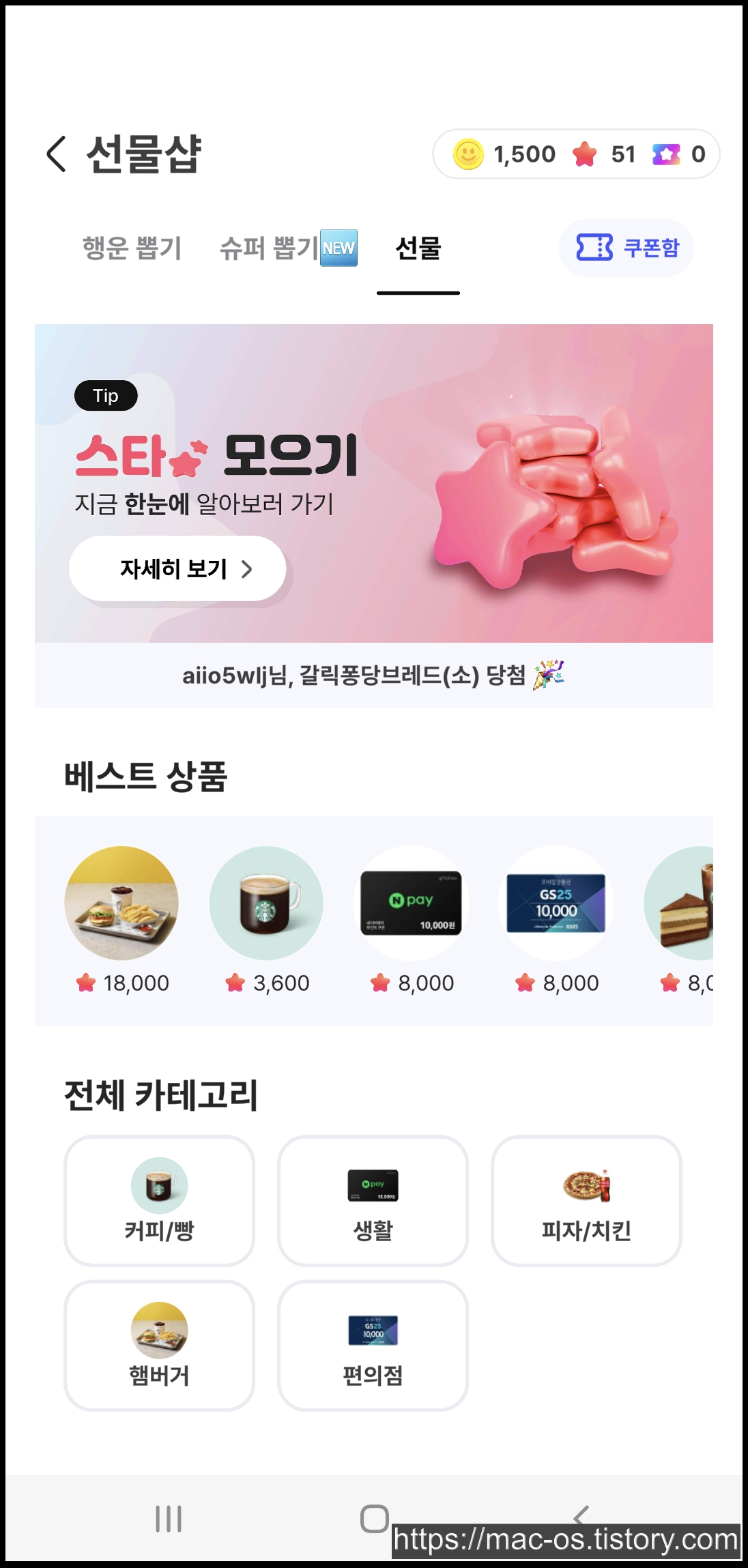 - 코인은 행운 뽑기로 기프티콘을 뽑는 데 쓰이고, 스타는 기프티콘을 구매하는 데 쓰인다.