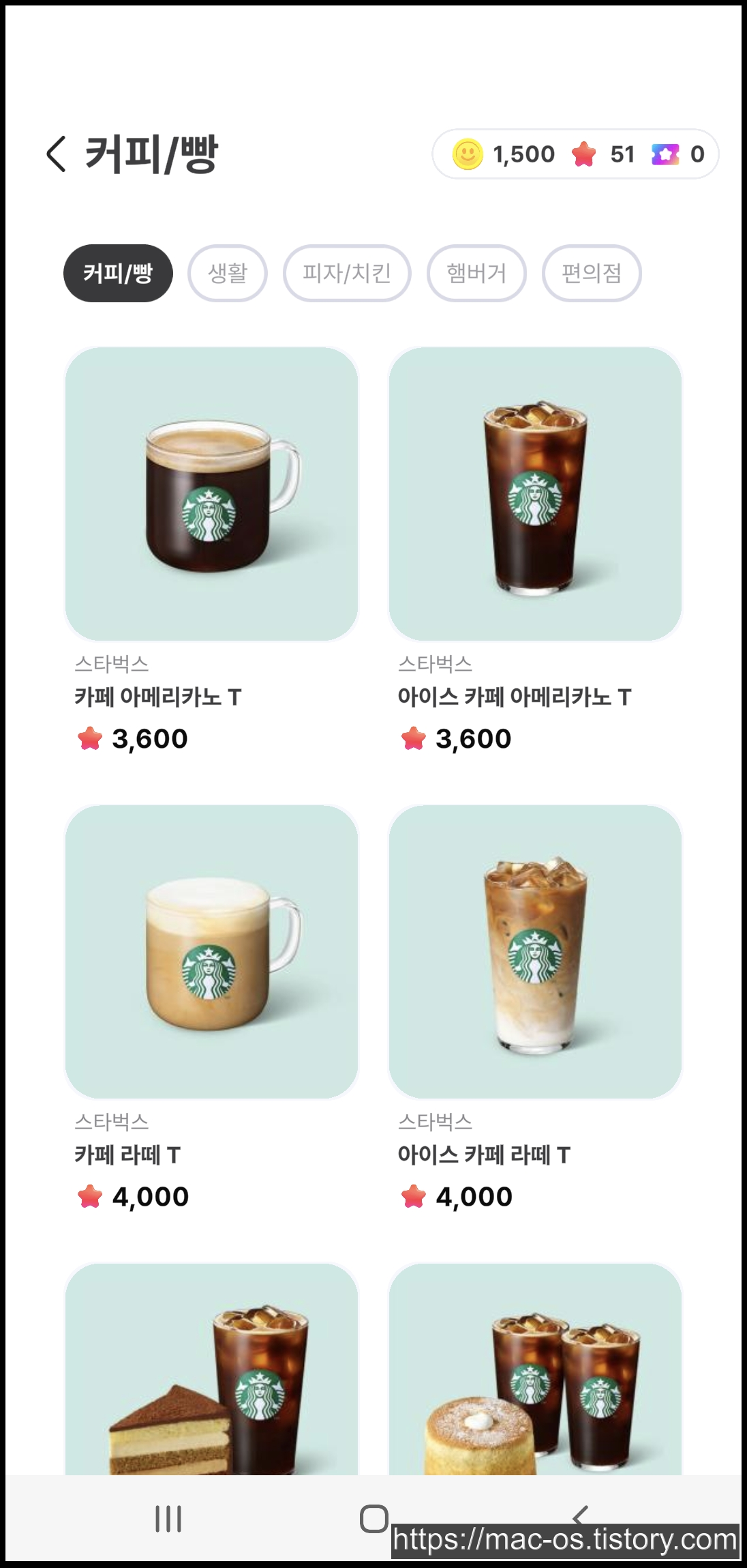 그외에도 스타벅스 아메리카노 기프티콘이나 배스킨라빈스 싱글레귤러 아이스크림 기프티콘, 최소 20스타부터 2000스타까지, 1000코인부터 2만 코인까지 등장합니다.