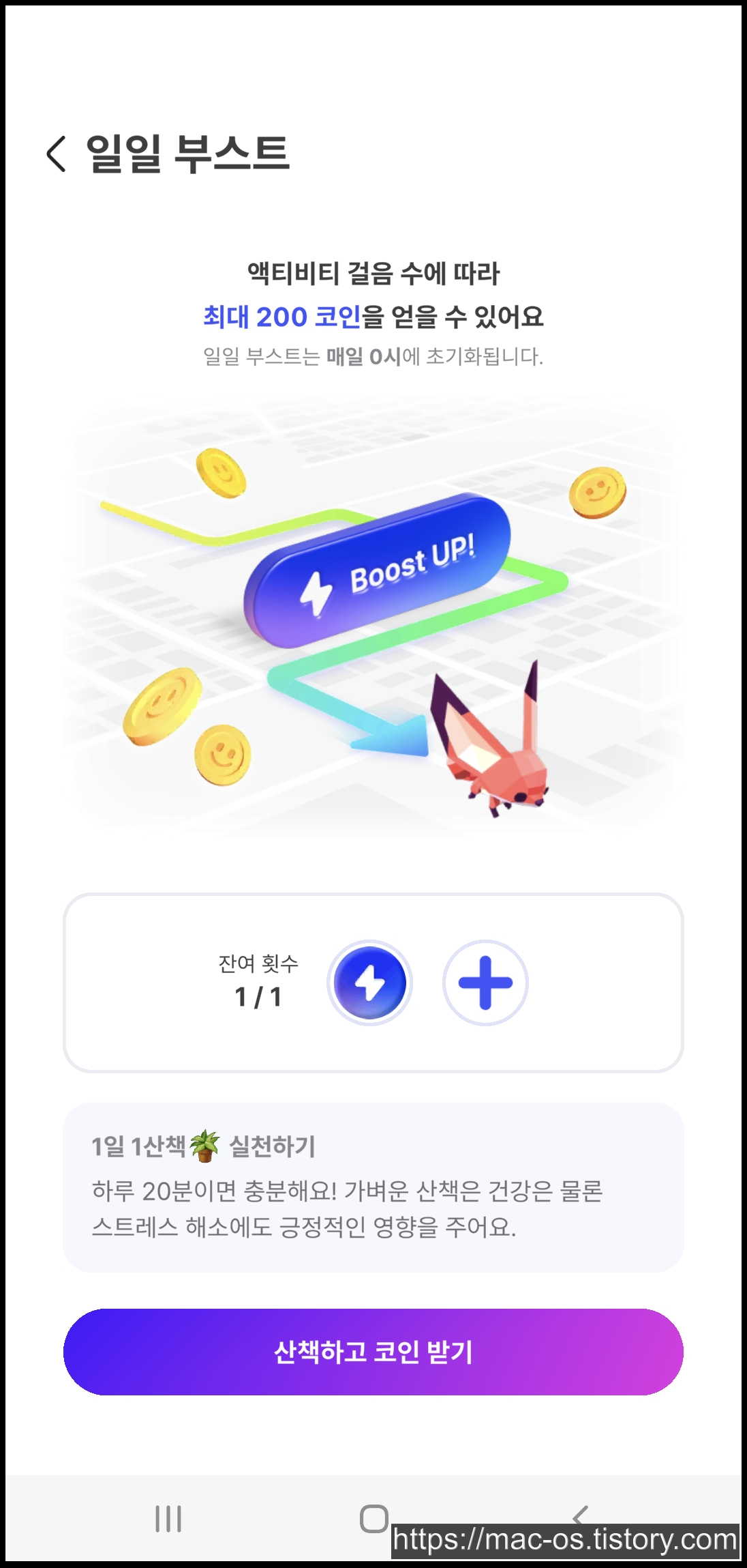 일일 부스트는 액티비티 걸음 수에 따라 최대 200코인을 얻을 수 있는 혜택입니다. 하루에 1번 산책하고 코인 받기 버튼을 누르면 오른쪽 사진처럼 시간이 흐르게 되고, 이 때 산책을 하면 GPS를 통해 얼마나 걸었는지 측정하게 됩니다.
