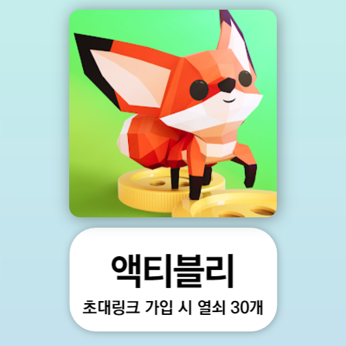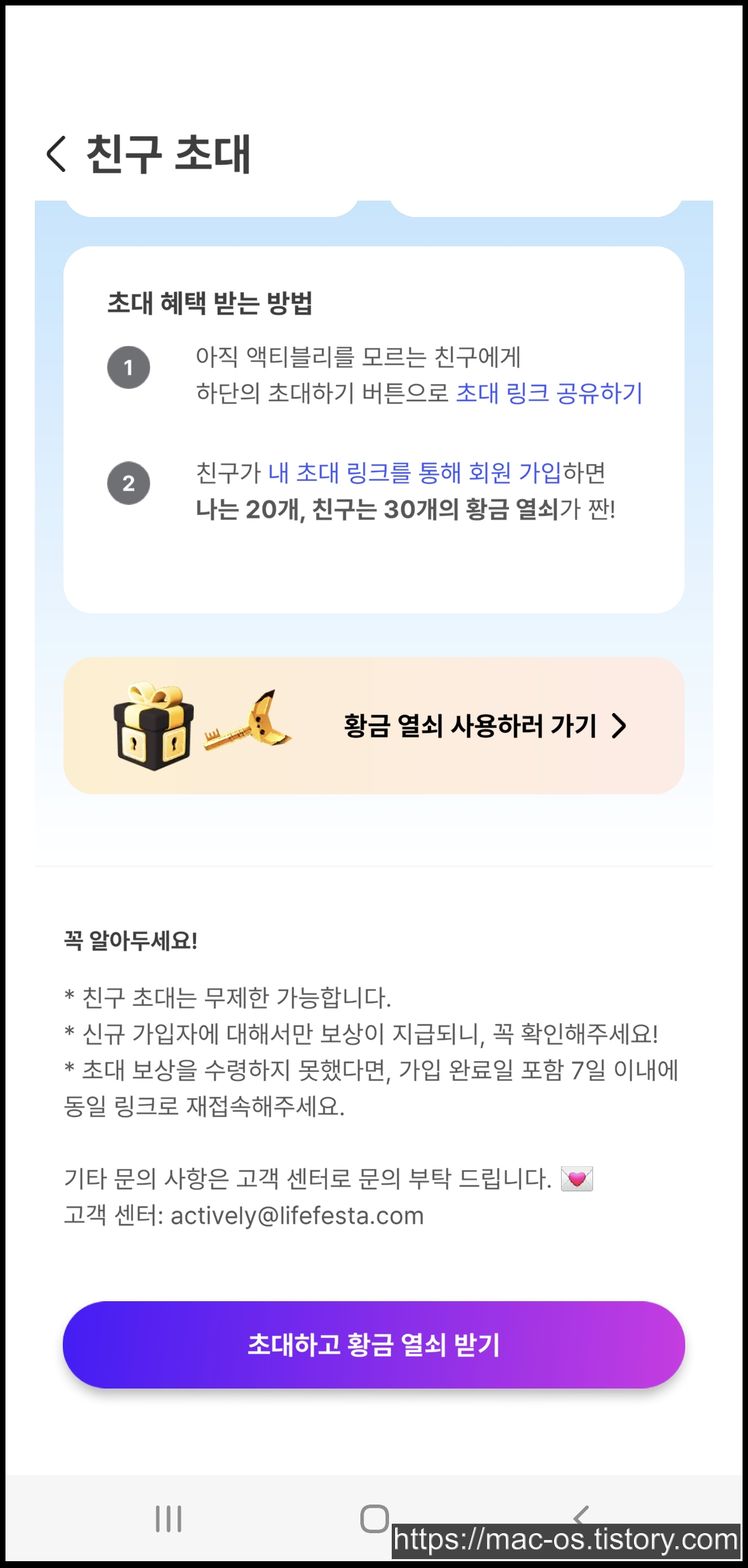 액티블리에서 진행하고 있는 친구초대 이벤트입니다. 액티블리를 모르는 친구에게 하단의 초대하기 버튼으로 초대 링크를 공유하고, 친구가 내 초대링크를 통해 회원 가입하면 나는 20개, 친구는 30개의 황금 열쇠를 받을 수 있습니다.