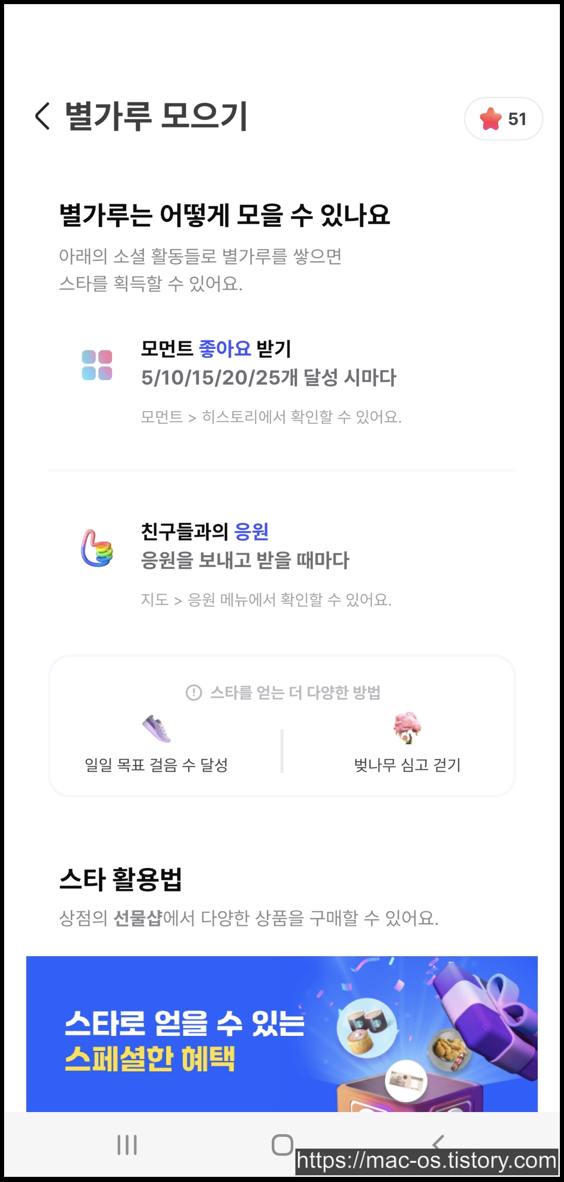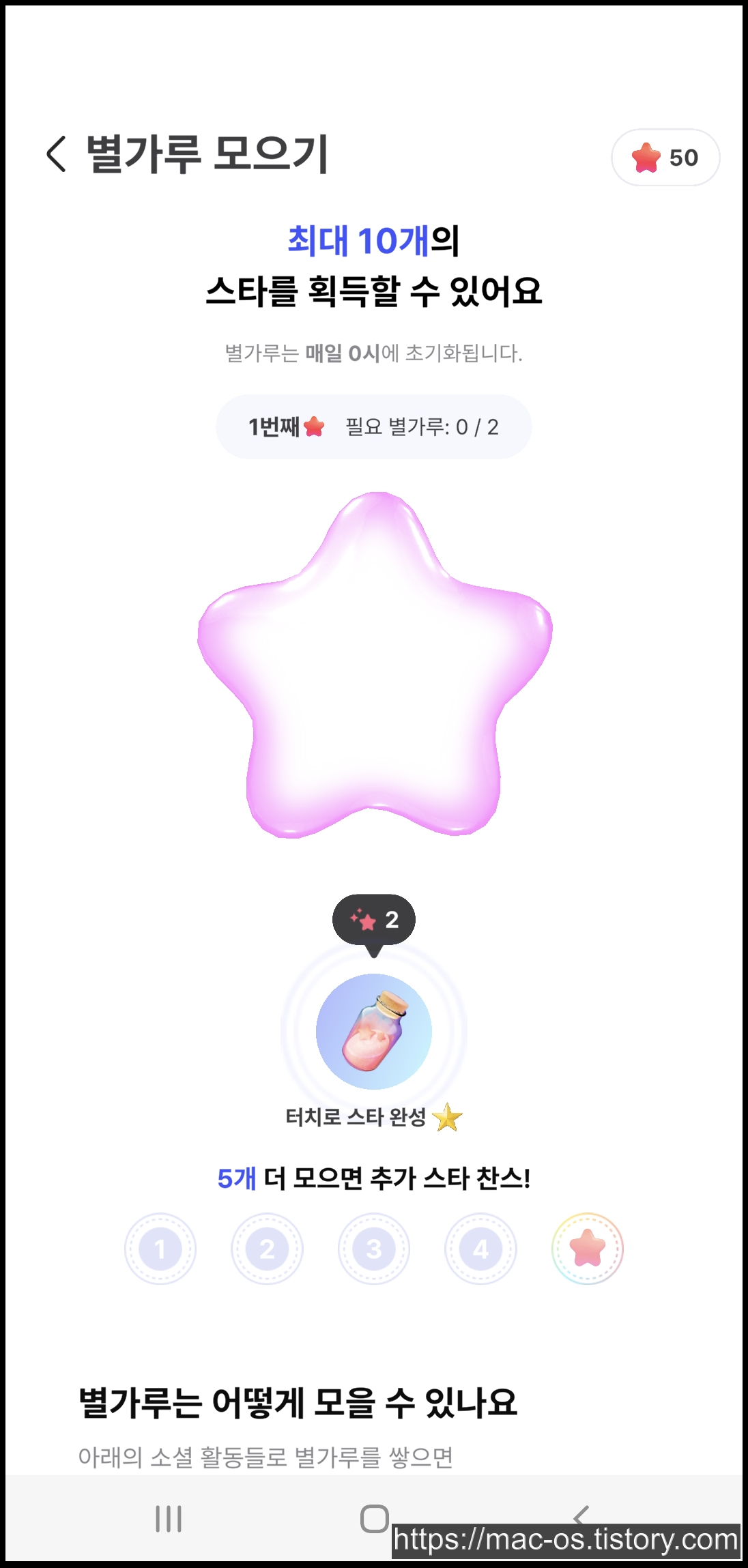 별가루 모으기는 모먼트 좋아요 받기, 친구들과의 응원, 일일 목표 걸음 수 달성 등을 통해 별가루를 모아 별을 완성하는 것입니다. 별가루를 사용하여 별을 완성하면 단계별로 보상으로 스타를 받을 수 있습니다.