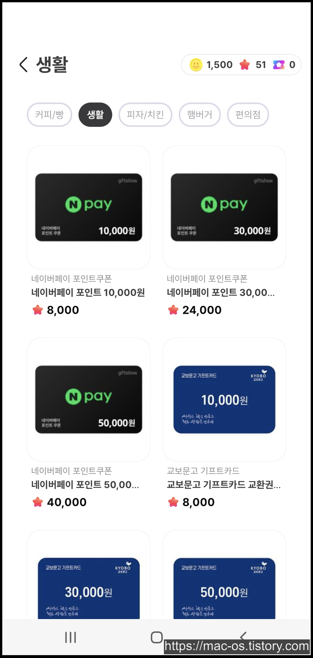 스타벅스 카페 아메리카노, 네이버페이 포인트 쿠폰 등 다양한 상품이 있으며 스타와 현금의 비율은 1:0.8로 현실에서 1만원에 해당하는 상품을 구매하려면 8000스타가 필요합니다.