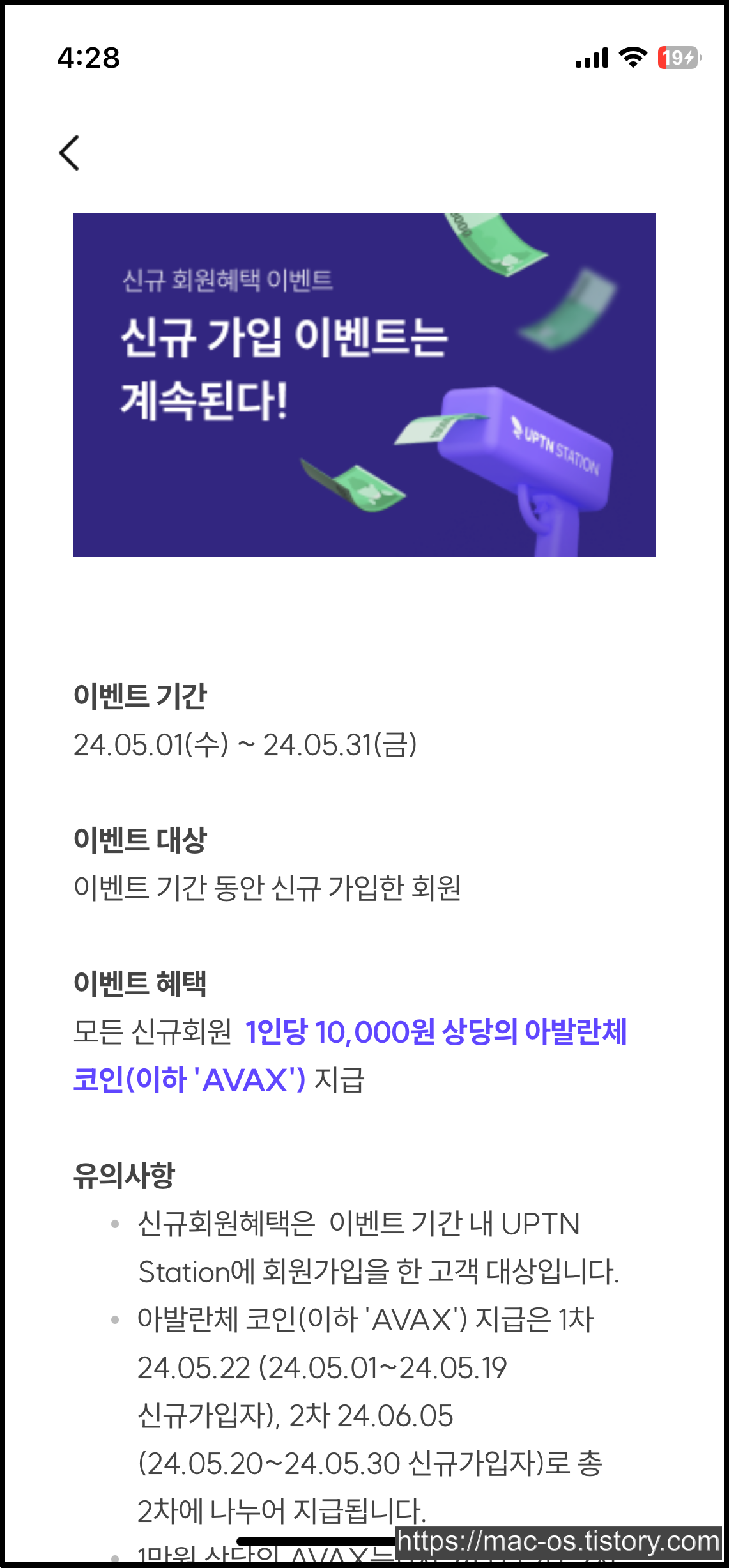 업튼 친구초대 이벤트 말고도 다른 이벤트가 있는데요. 5월 31일까지 진행되는 이벤트로 모든 신규회원 1인당 1만원 상당의 아발란체 코인 AVAX를 준다고 합니다. 그리고 업튼에서는 출석체크를 하면 UP라는 포인트를 주는데요.