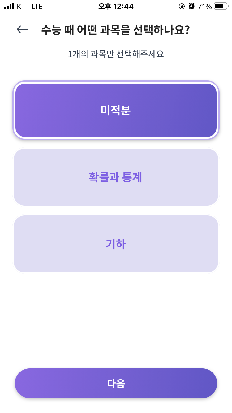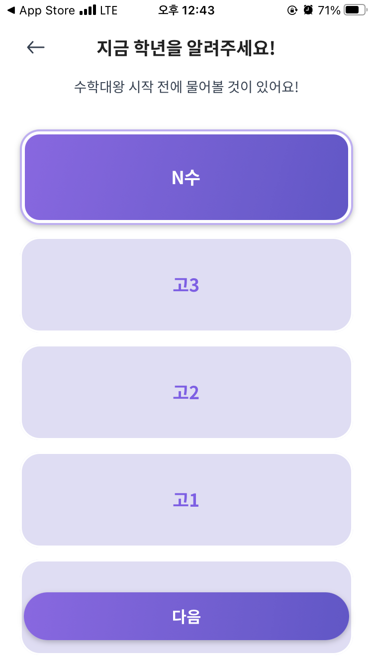학년과 과목, 등급을 설정하고 다음을 눌러주세요.
