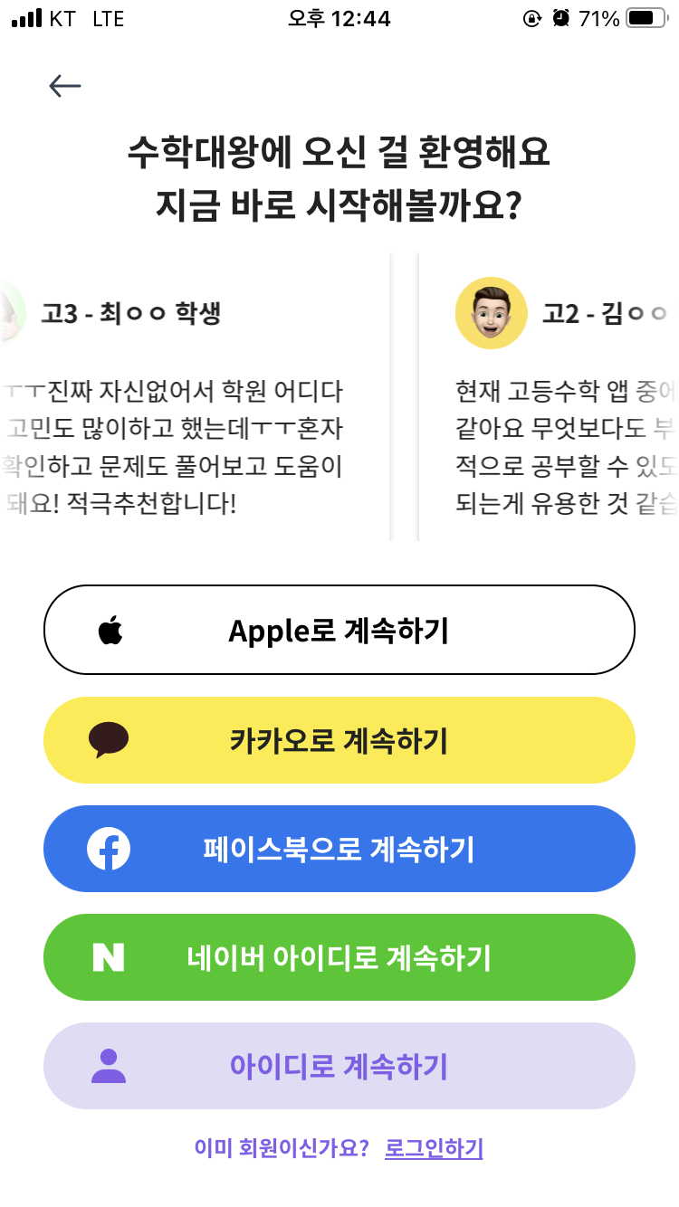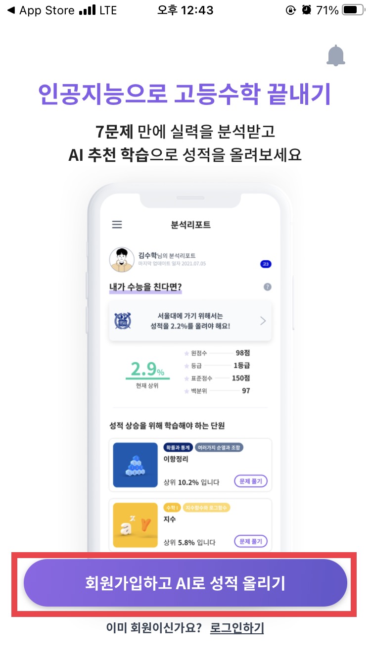앱을 실행하시고 '회원가입하고 AI로 성적 올리기'를 눌러주세요.