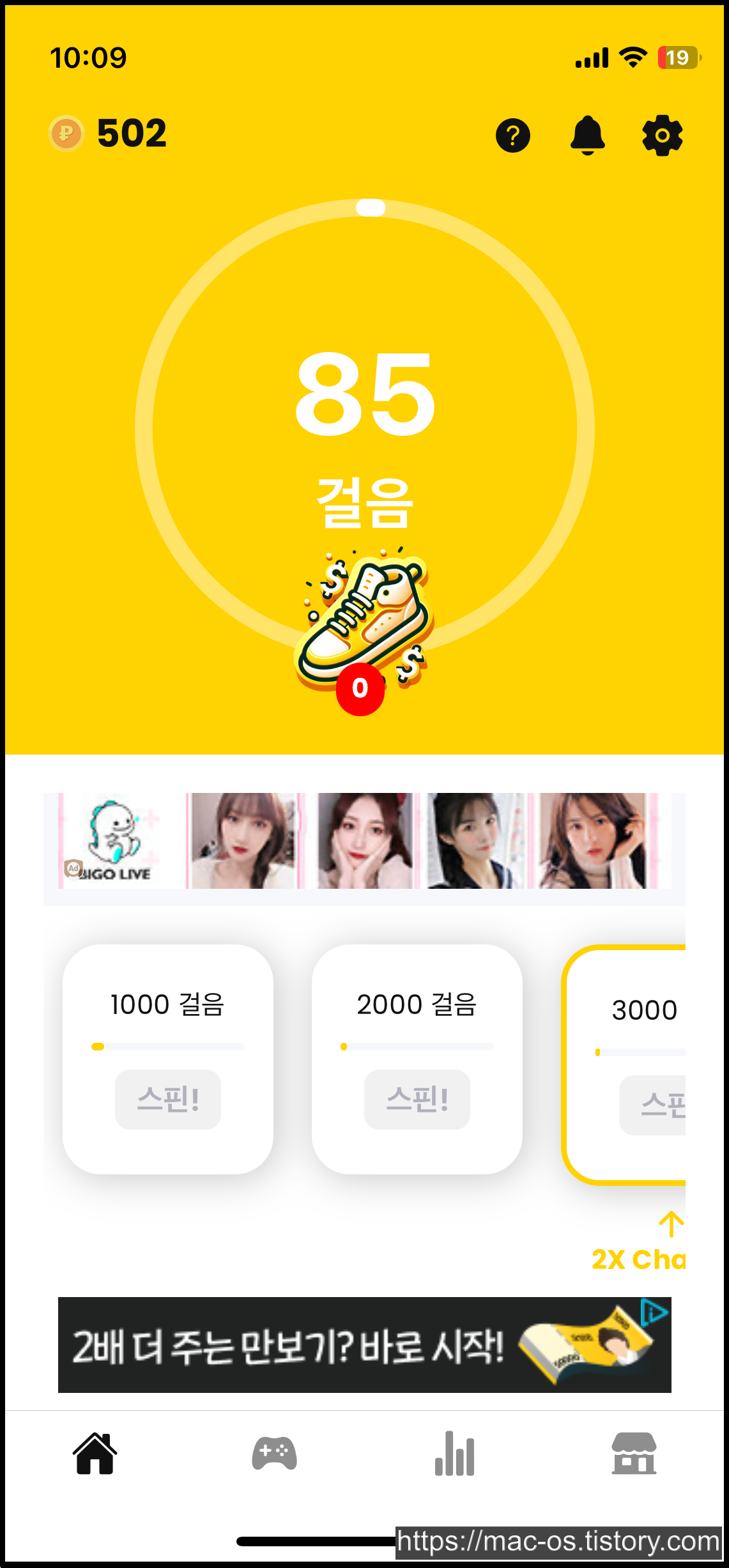 홈 화면에서 하단을 보면 걸음 수마다 스핀! 이라고 적혀있는데요. 3000, 6000, 10000 걸음에 룰렛을 돌릴 수 있고, 룰렛에서 나오는 포인트 보상이 2배, 3배, 4배 이런 식으로 증가하는 듯 합니다.