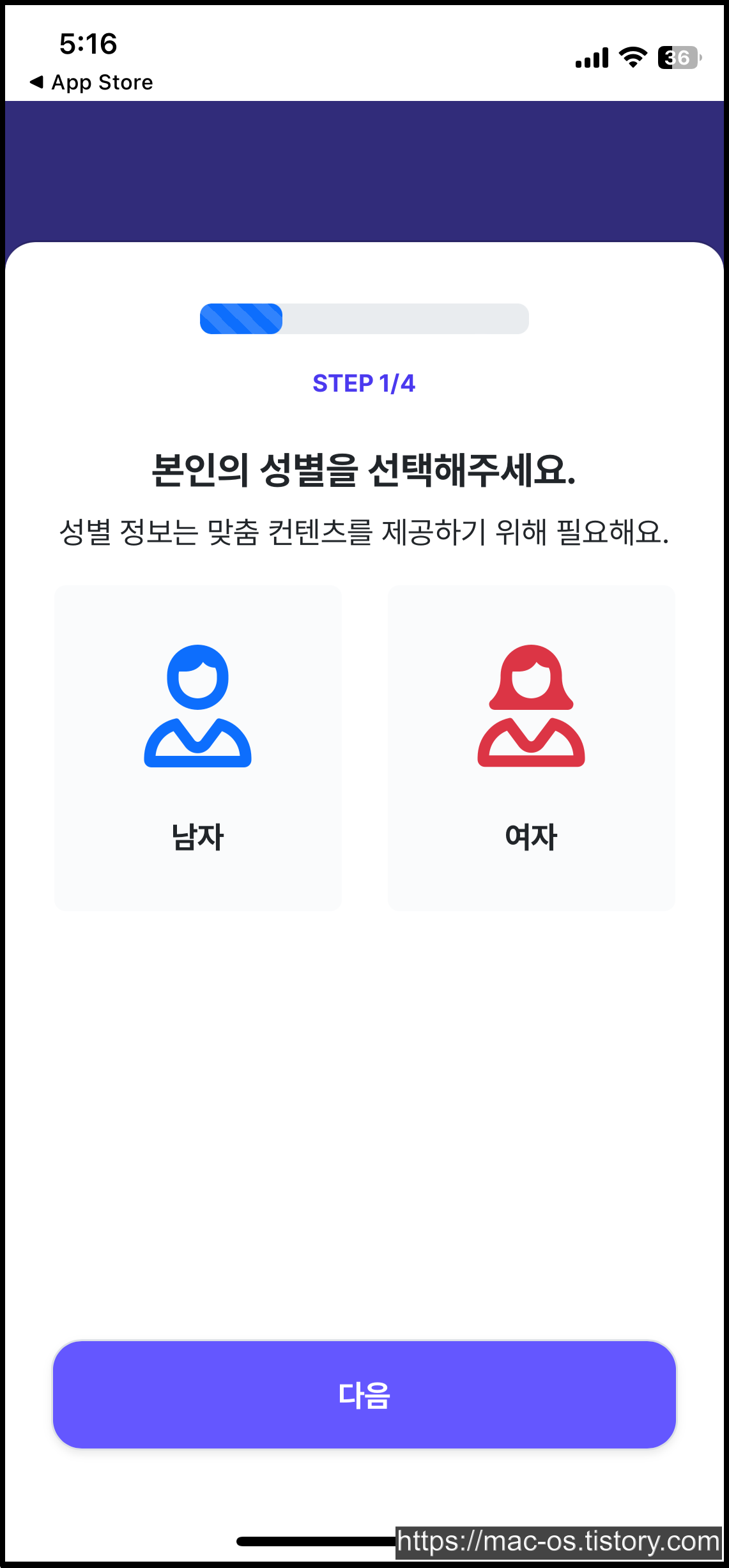 휴대폰으로 발송된 인증번호를 입력하고 성별을 선택합니다.