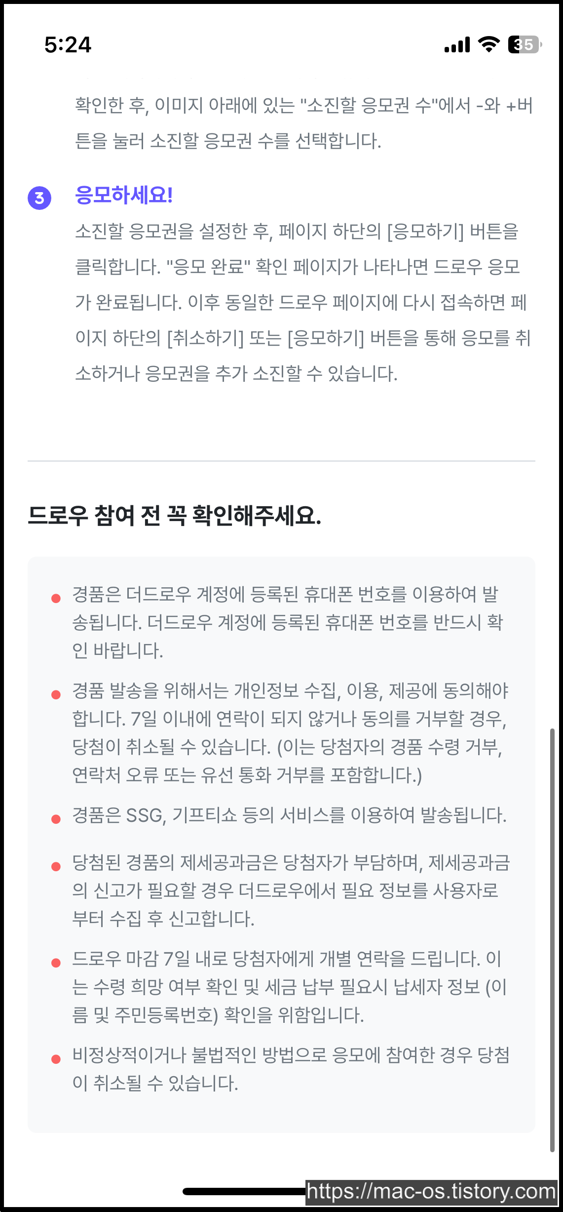 아까 랜덤박스를 열어서 스탬프 5개를 얻었는데요. 그게 응모권 1개로 자동 교환되어서 응모권을 사용해보겠습니다. 드로우에 당첨되면 마감 7일 내로 당첨자에게 개별 연락을 주고 수령 희망 여부 확인 및 세금 납부 필요시 납세자 정보 확인을 한다고 하네요.