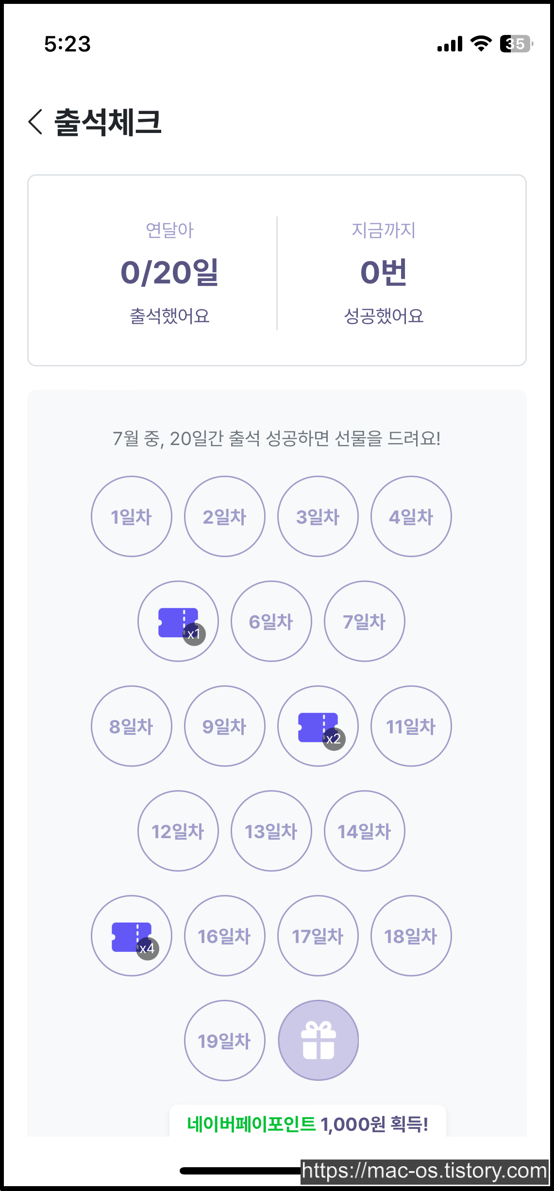 출석체크 배너를 누르면 매일 출석체크를 하고 스탬프 1개를 받을 수 있습니다. 5일차, 10일차, 15일차마다 응모권 1개를 받을 수 있고, 한 달간 20일 출석에 성공하면 네이버페이 포인트 쿠폰 1000원이 확정으로 지급됩니다.