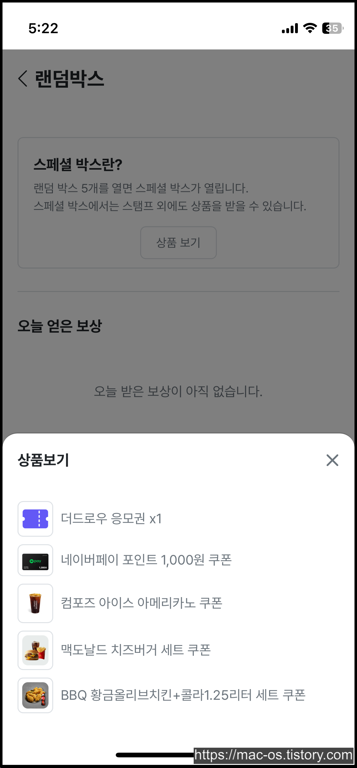 5번째 스페셜 박스에서는 스탬프 외에도 응모권, 네이버페이 포인트 쿠폰, 컴포즈 아이스 아메리카노 쿠폰 등의 상품이 등장하며 랜덤박스는 자정이 되면 초기화되어 다시 참여할 수 있습니다. 여기서 스탬프는 5개를 모으면 자동으로 응모권으로 교환됩니다.