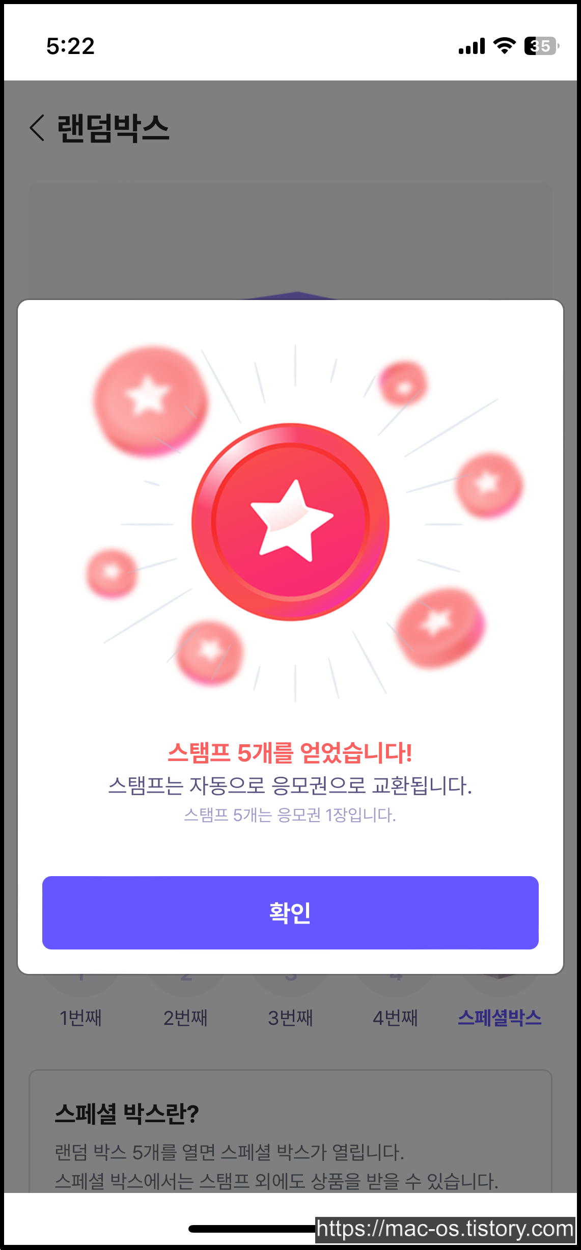 랜덤박스라는 배너를 눌러봤습니다. 랜덤박스는 2시간 간격으로 하루 최대 5회 상자를 열 수 있으며, 상자 개봉 시 일정 확률로 스탬프를 최대 5개까지 받을 수 있습니다.