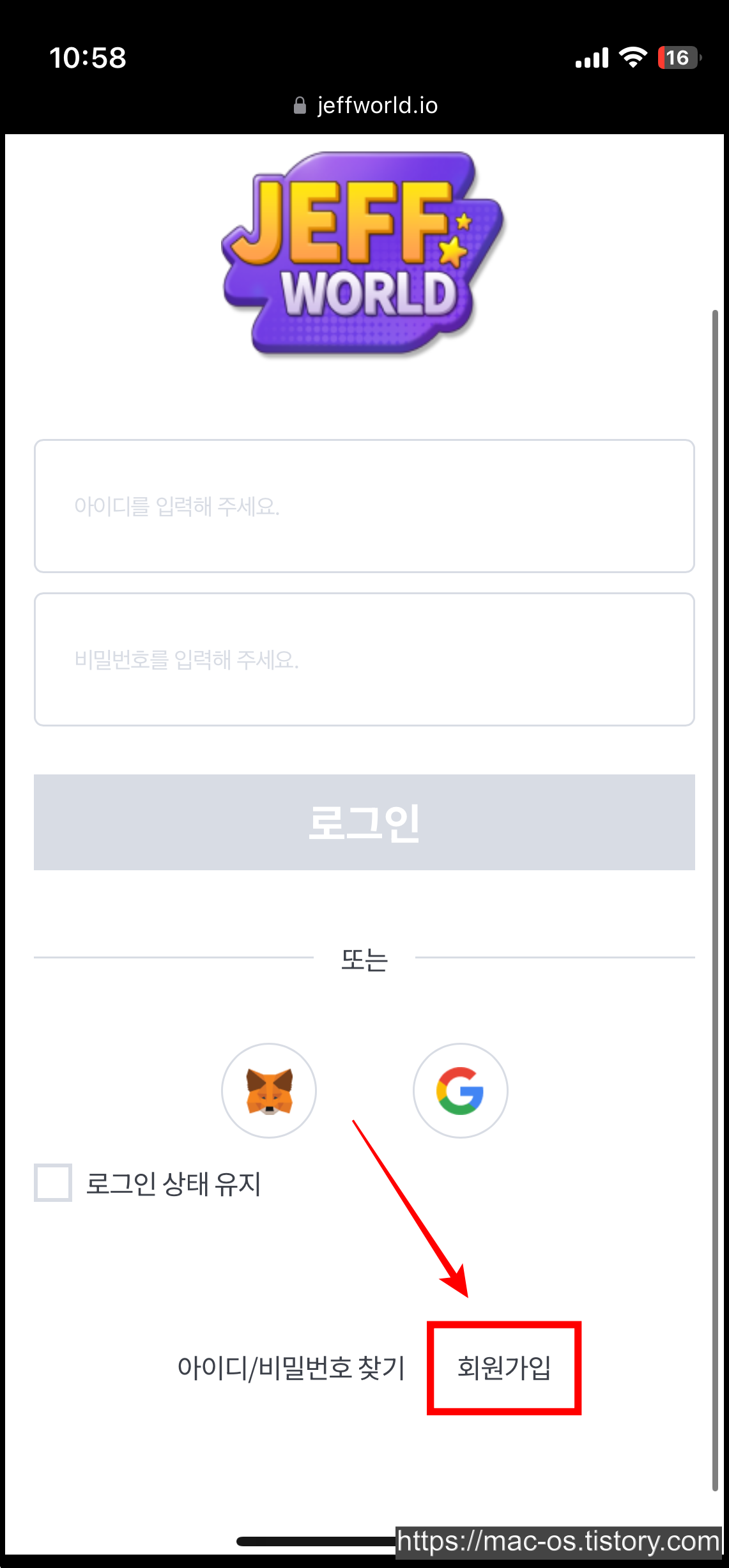 제프월드는 제프월드, 구글, 메타마스크 3개로 가입할 수 있습니다. 저는 구글로 가입했는데 오른쪽 사진처럼 PC 사이즈에 최적화되어 있다며 가입이 안되는 경우가 있는데요. 확인을 누르고 뒤로가기 몇 번을 누르니까 모바일에서도 회원가입이 됐습니다.