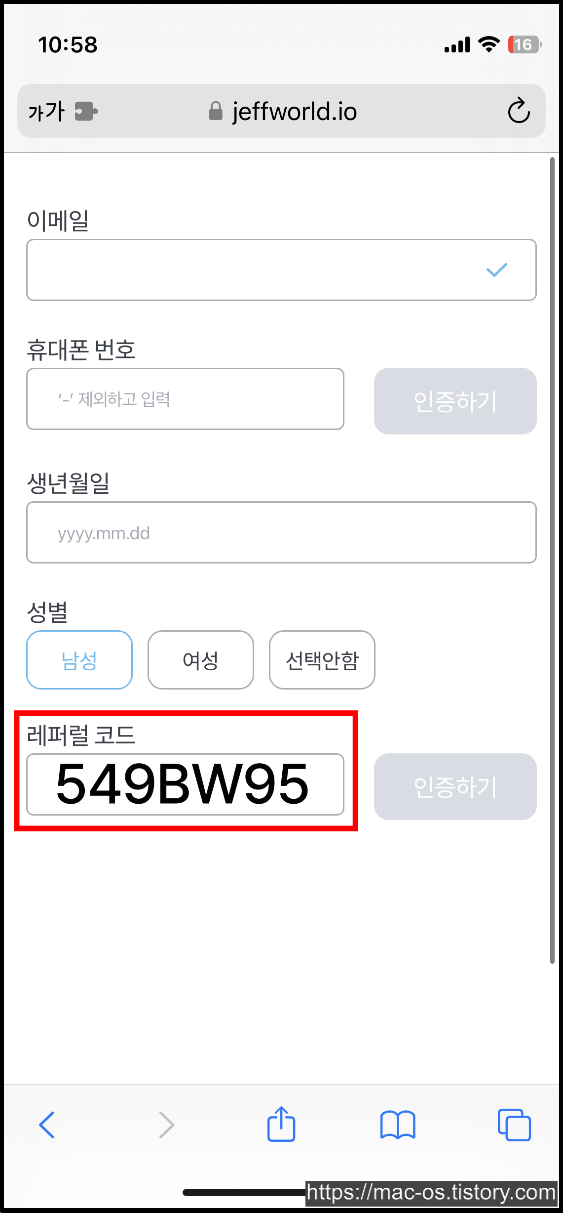 약관에 동의하고 이메일, 휴대폰 번호, 생년월일, 성별, 레퍼럴 코드를 입력하면 제프월드 가입이 완료됩니다. 여기서 레퍼럴 코드는 추천인 코드를 말하는 건데요. 입력할 코드가 없으신 분들은 549BW95를 꾹 눌러서 복사한 다음 입력하시면 됩니다.