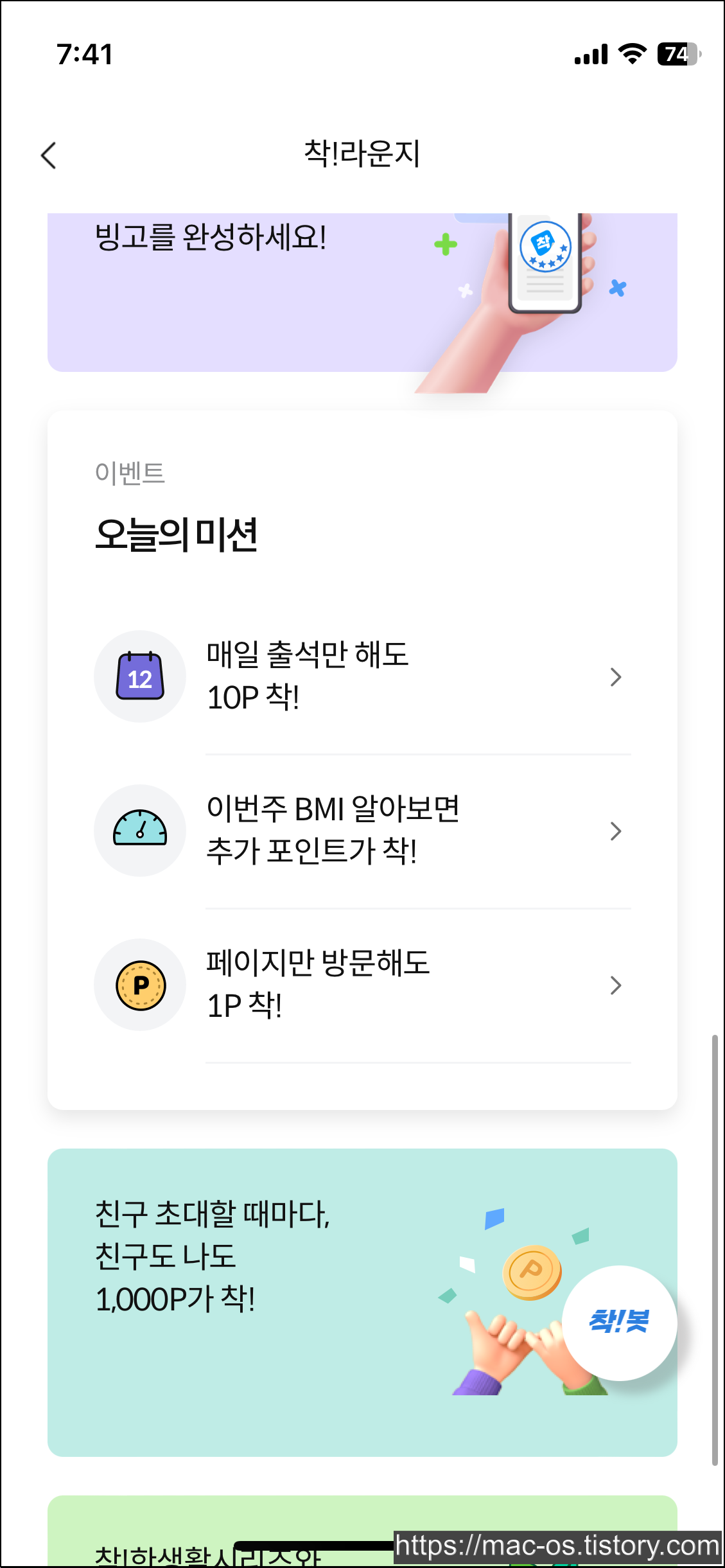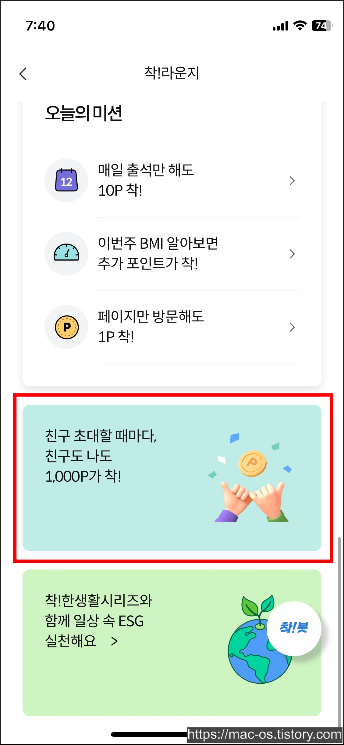 아래로 쭉 스크롤을 내리면 친구초대 배너가 있습니다.