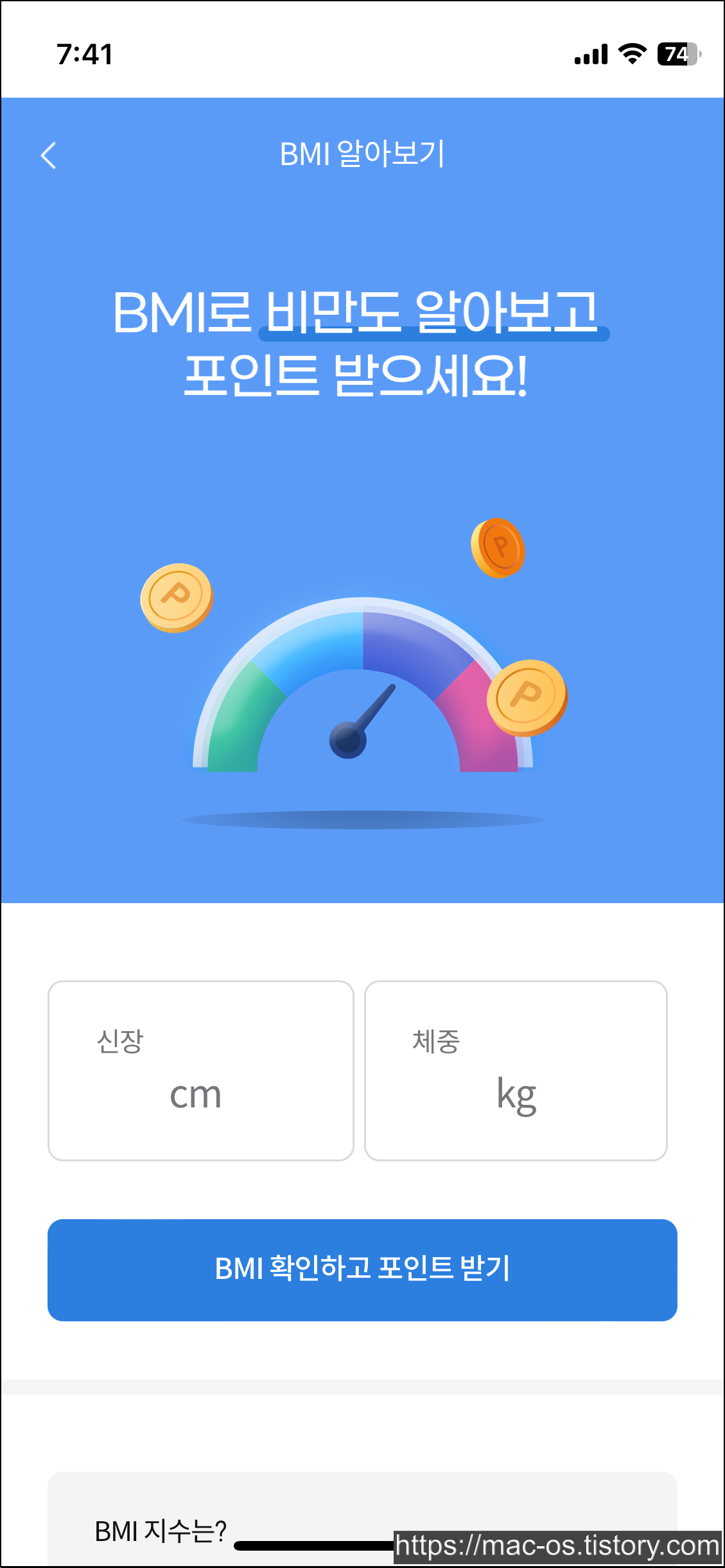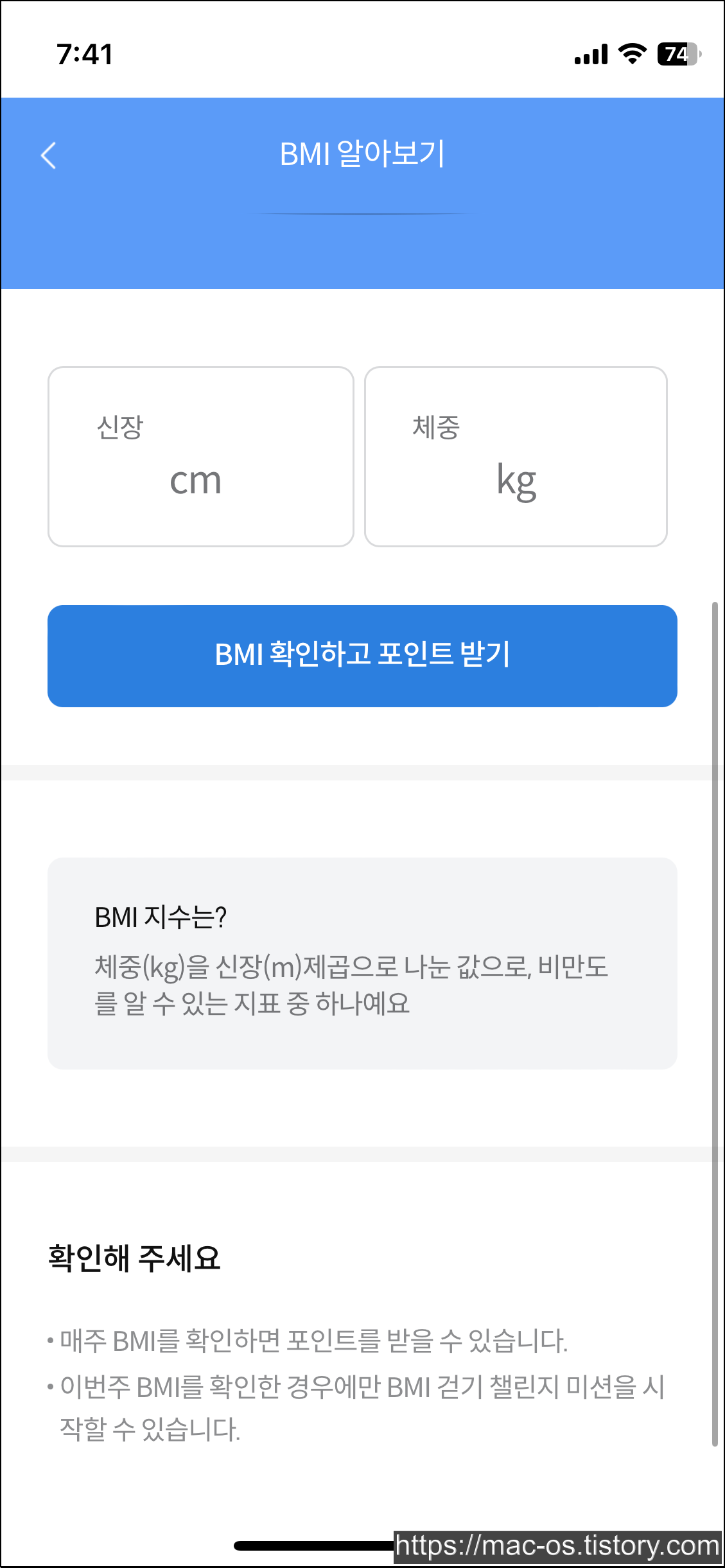 매주 신장과 체중을 입력해서 BMI를 확인하면 10포인트를 받을 수 있습니다. 이번주 BMI를 확인하면 BMI 걷기 챌린지 미션을 시작할 수 있습니다.