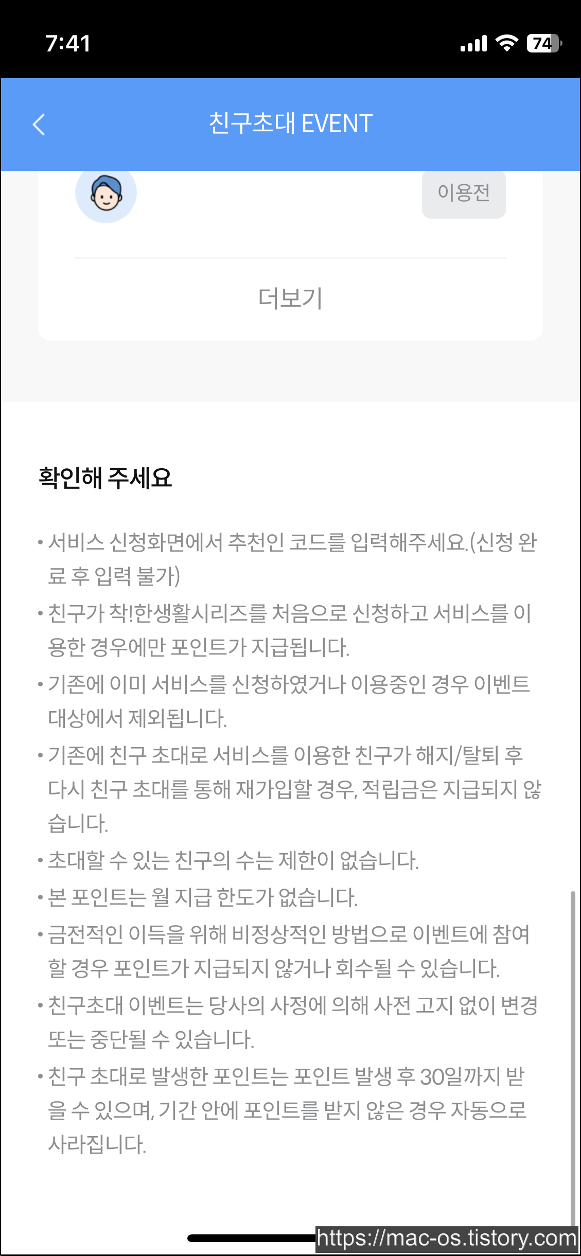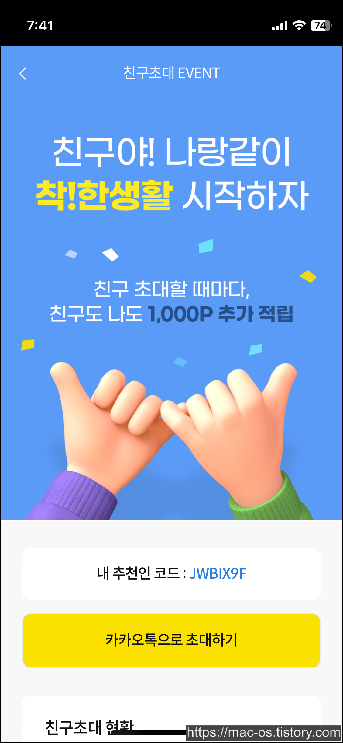 친구초대 이벤트에 대해 설명해보자면, 초대코드를 입력하면 초대코드를 입력한 사람과 초대한 사람 모두 1000포인트를 받을 수 있다는 것입니다. 여기서 받은 1000포인트는 현금 1000원과 동일한 가치를 지닙니다.