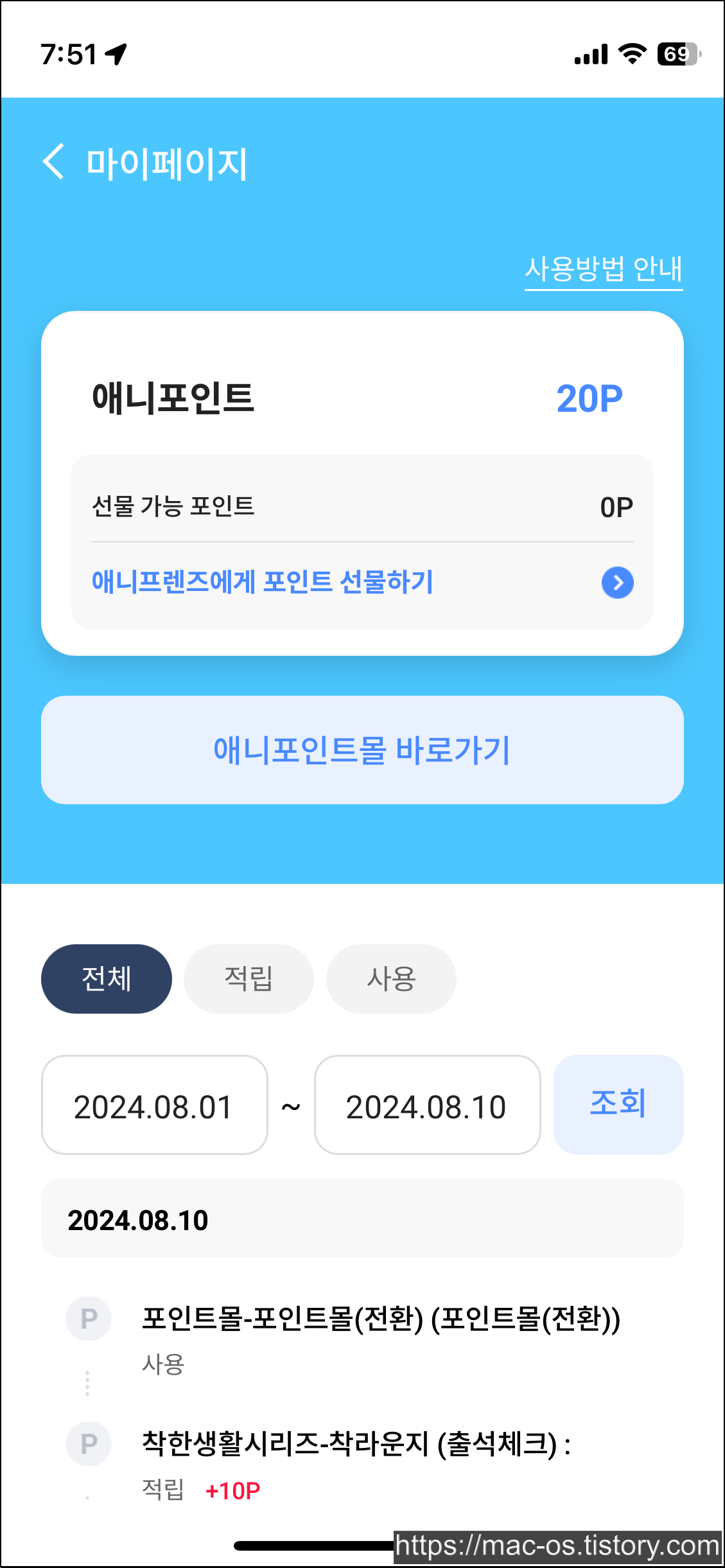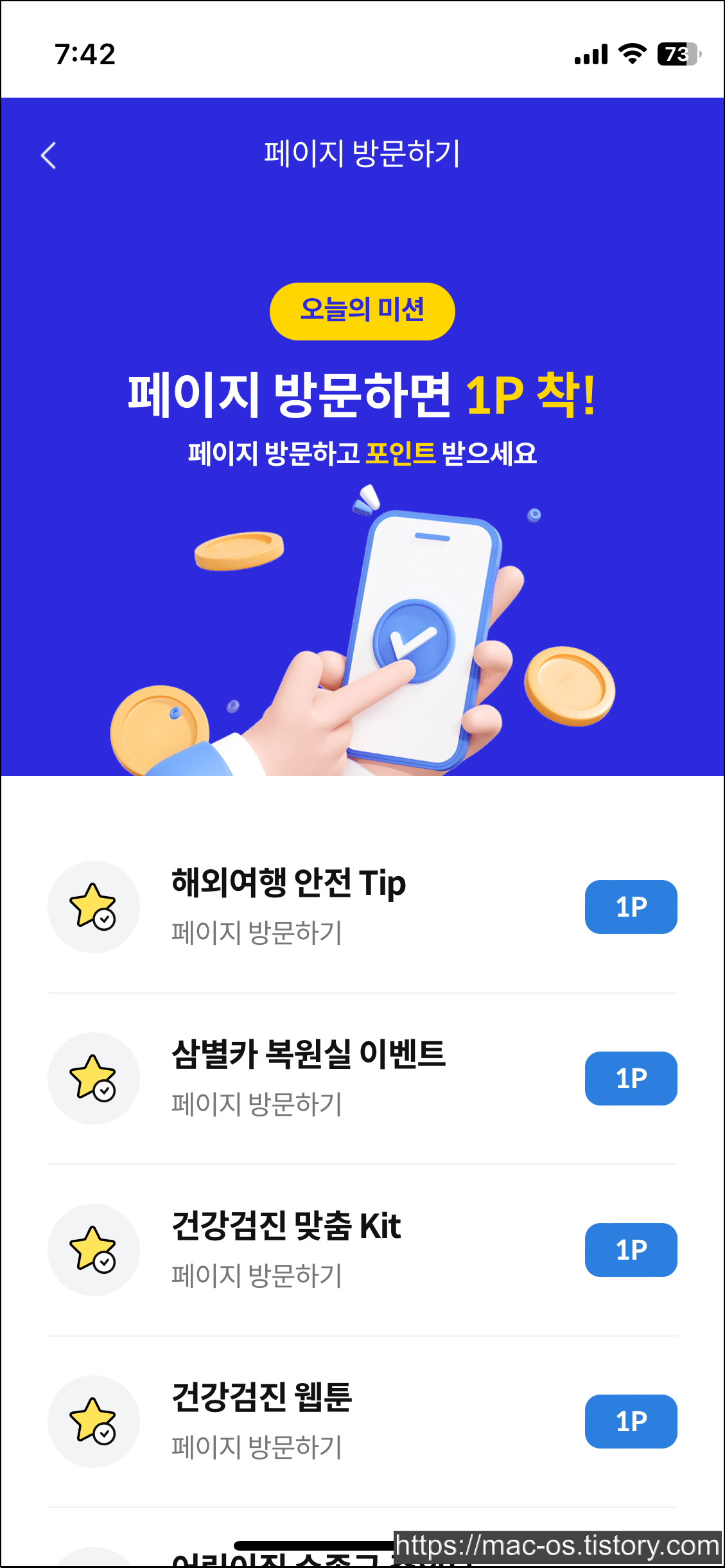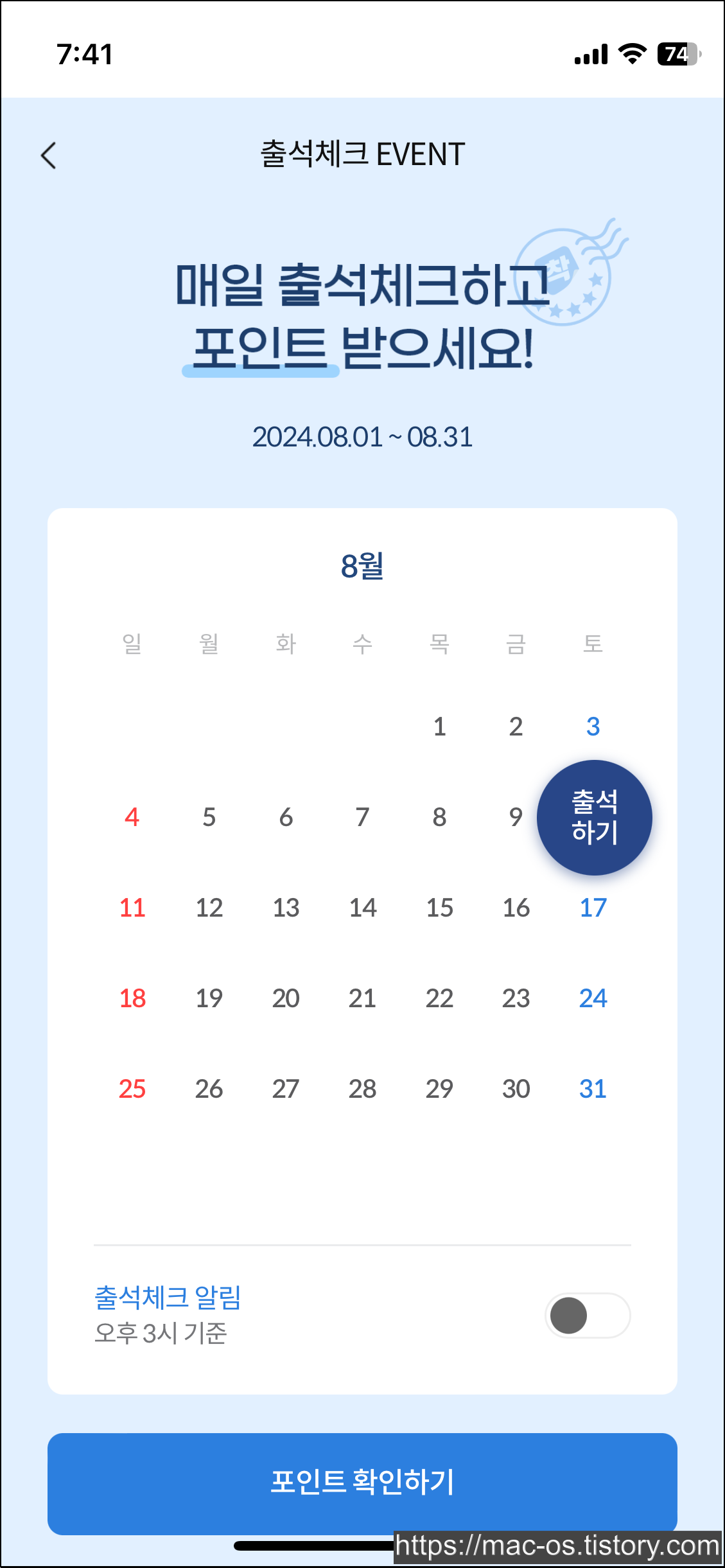 오늘의 미션에서 출석체크 페이지로 이동할 수 있는데, 매일 출석체크를 하면 10포인트가 적립됩니다.