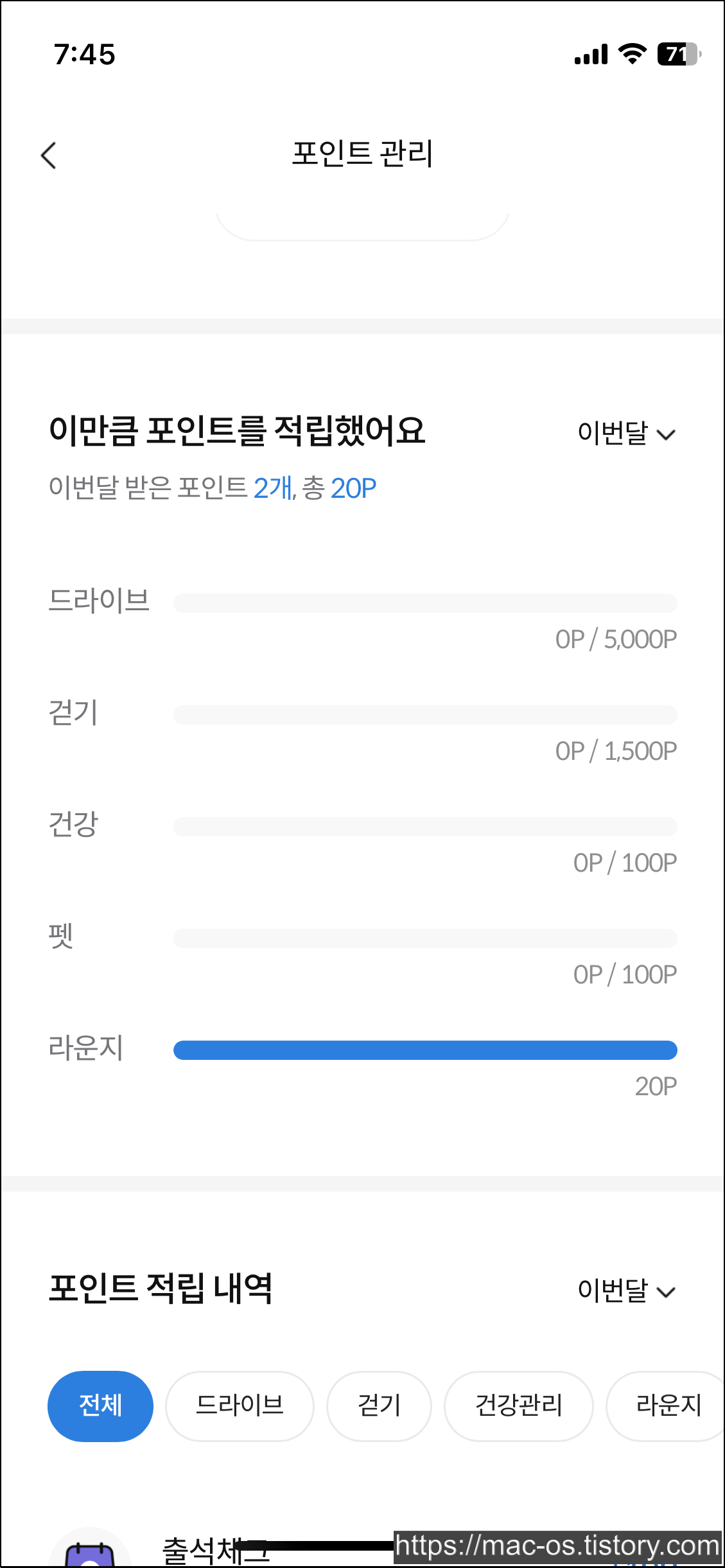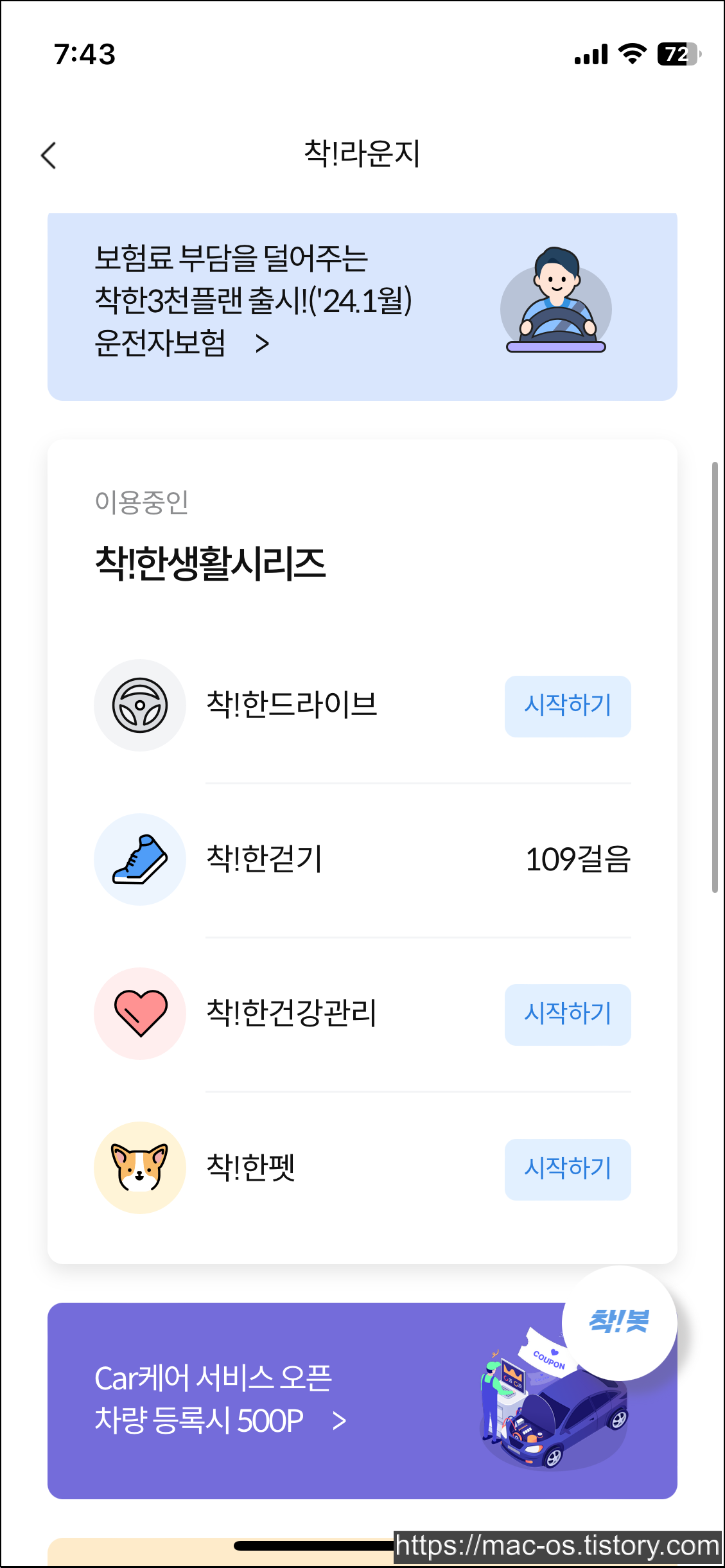 착한생활시리즈라고 드라이브, 걷기, 건강, 펫 이렇게 4가지가 있는데요. 드라이브에서 한달에 5000포인트, 걷기에서 1500포인트, 건강과 펫에서 100포인트를 얻을 수 있습니다.