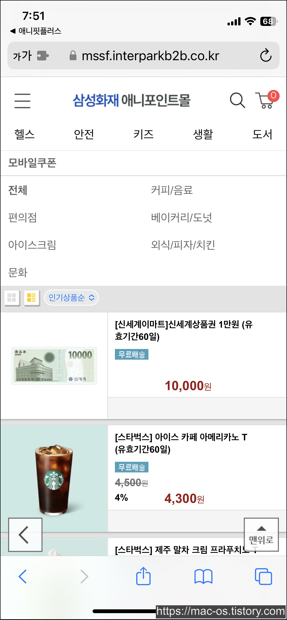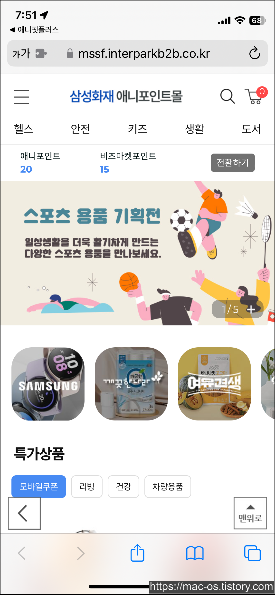 삼성화재 다이렉트 착에서 얻은 포인트는 애니포인트라고 하는데 애니핏플러스 앱에서 애니포인트몰 바로가기 버튼을 눌러서 현금처럼 사용할 수 있습니다. 애니포인트몰로 들어가면 애니포인트가 있는데 이걸 비즈마켓포인트로 전환해서 기프티콘을 구매하면 됩니다.