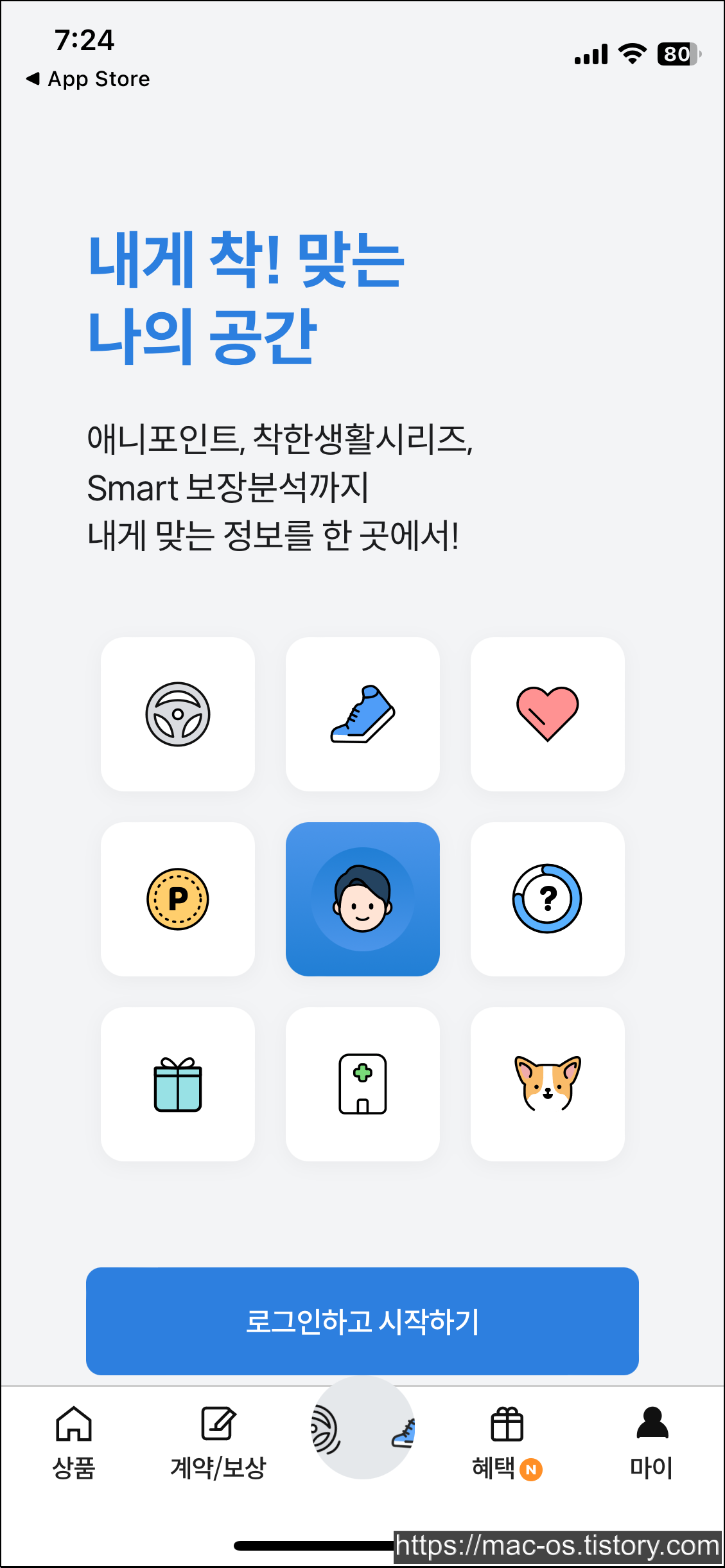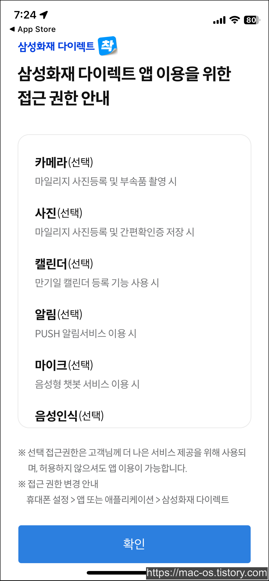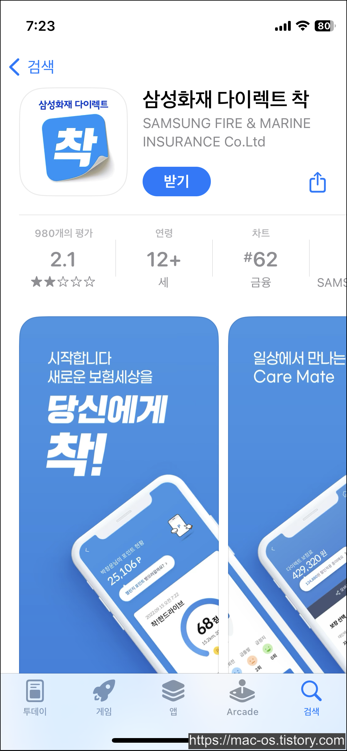 구글 플레이 스토어나 애플 앱스토어에서 삼성화재 다이렉트 착 앱을 설치하고 실행합니다.