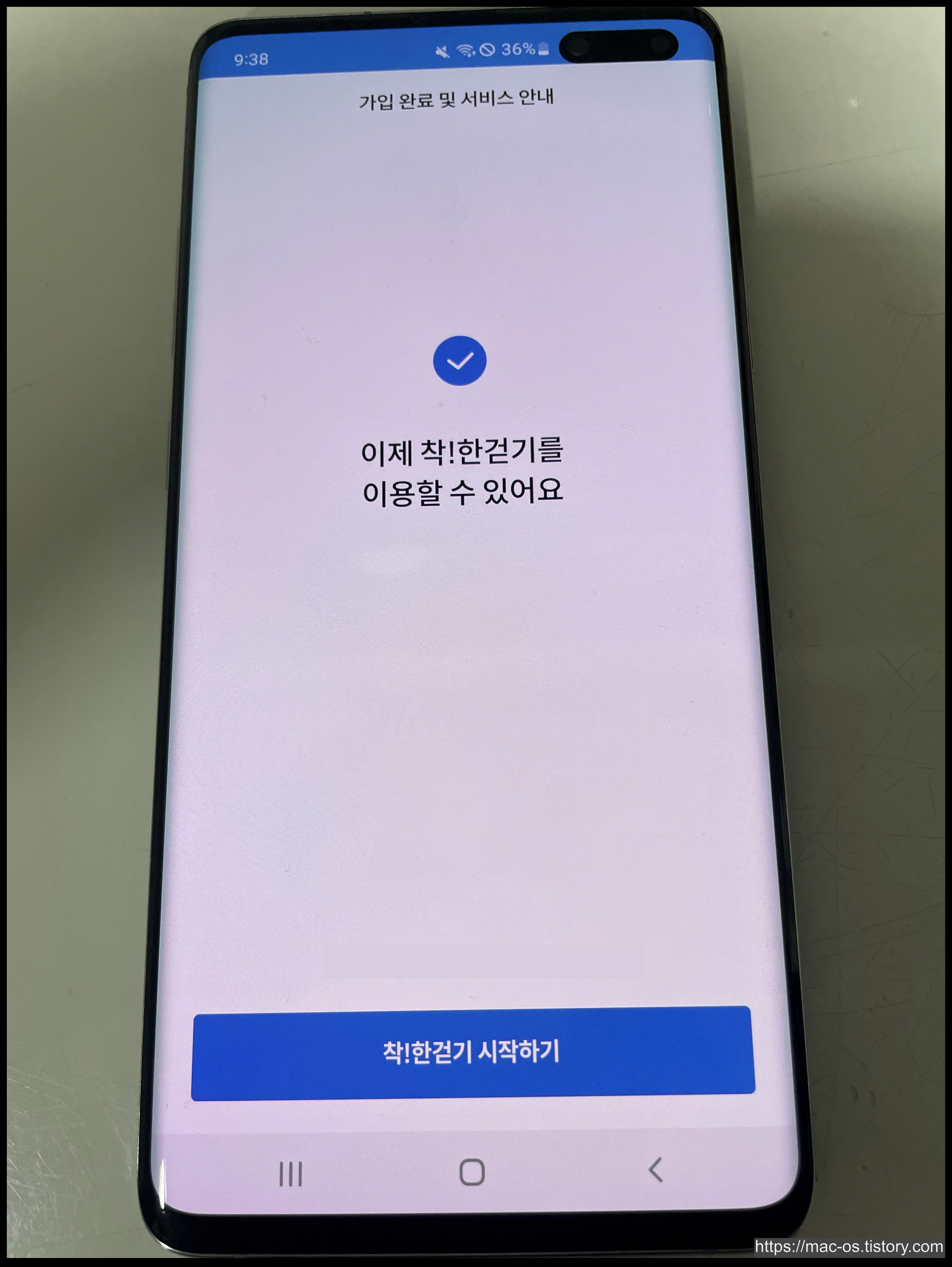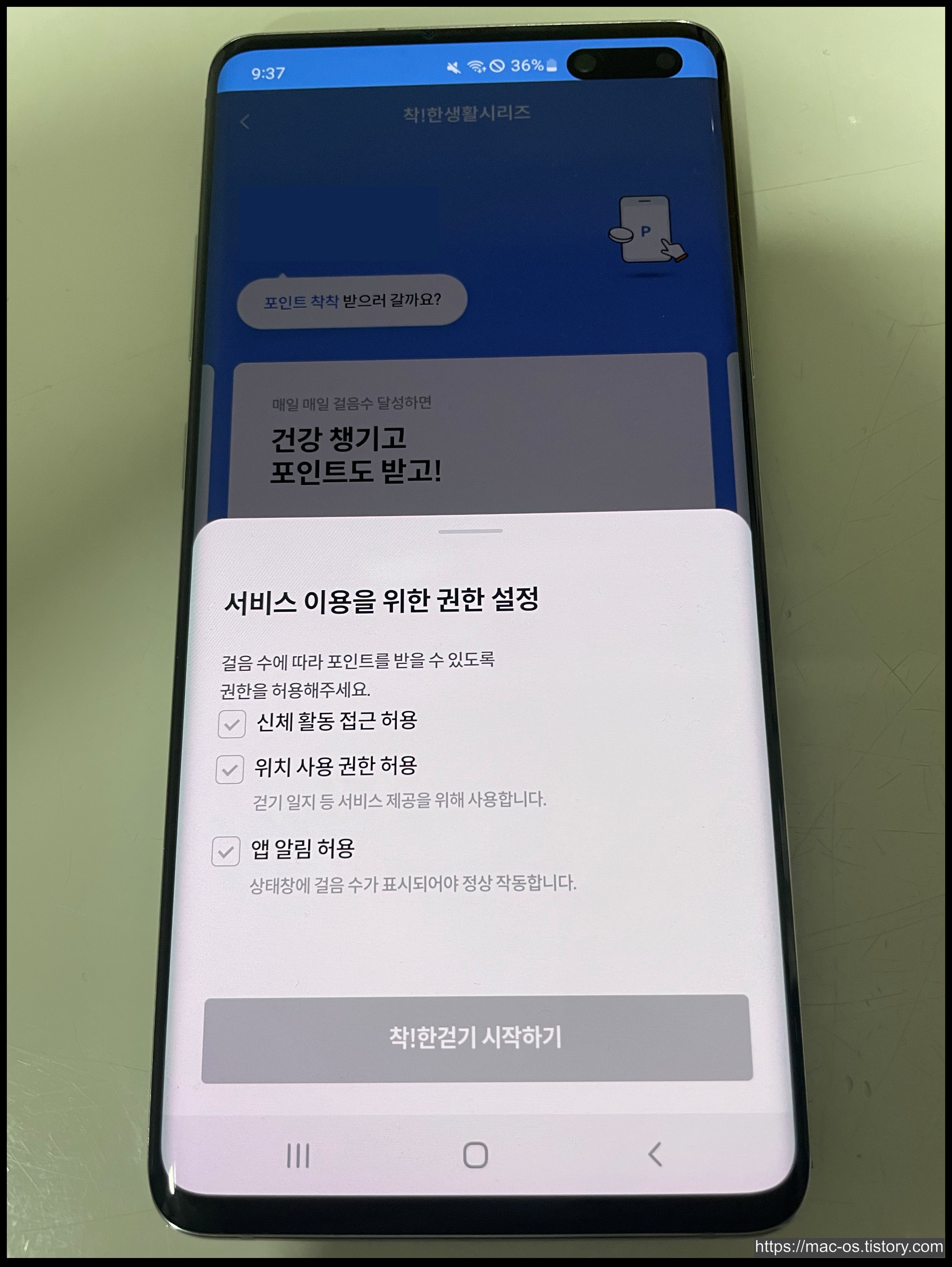 착한걷기 서비스를 이용하면 매일 6000걸음을 걷고 30포인트를 받을 수 있습니다. 오른쪽 사진은 홈 화면인데 여기서 화면 하단 중앙 버튼을 눌렀습니다.