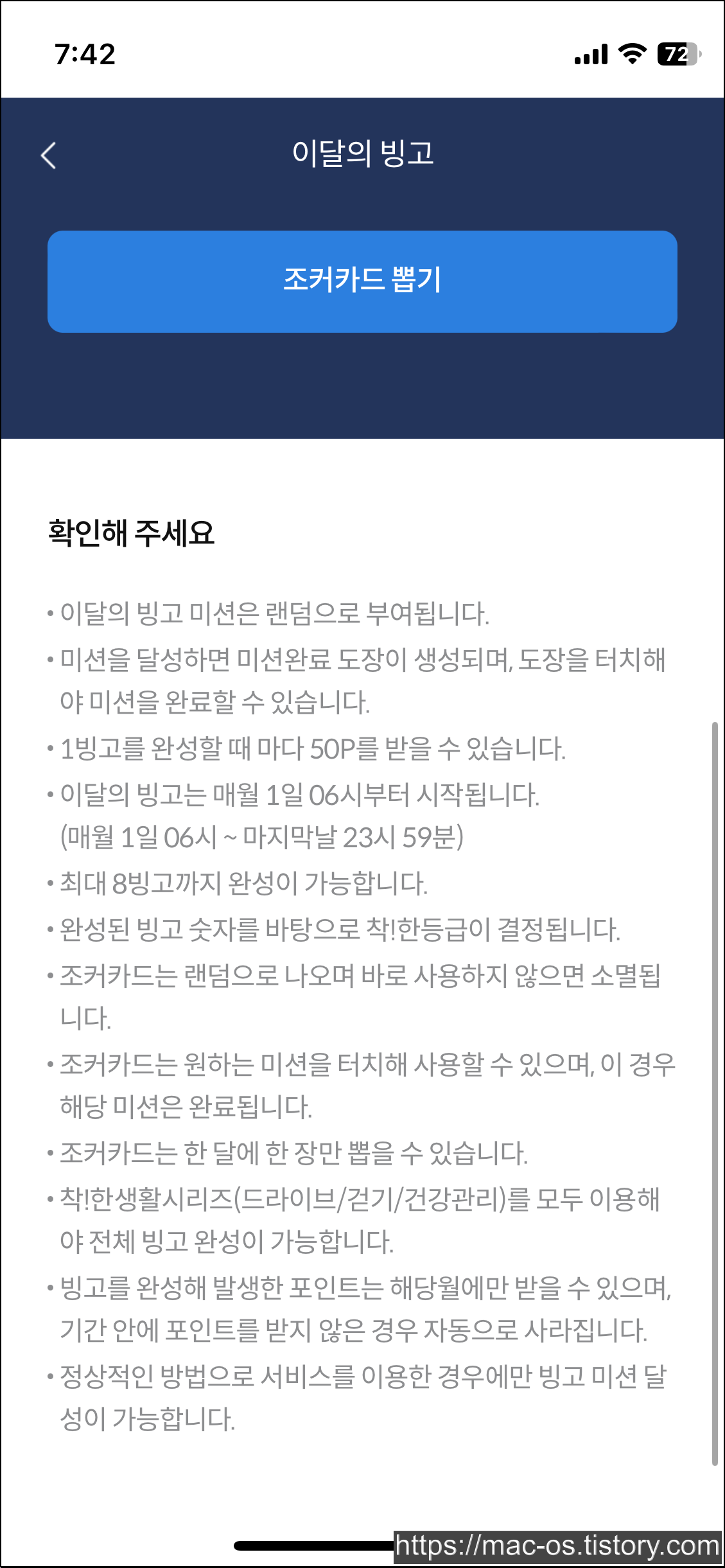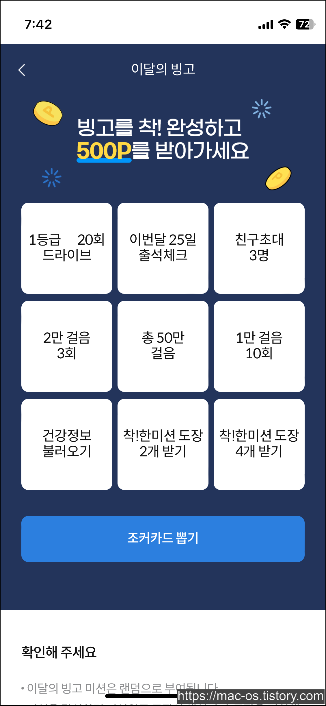 이달의 빙고라는 것이 있는데, 드라이브, 출석체크, 친구초대, 2만 걸음 3회 달성, 이런 미션을 완료하고 빙고를 완성할 수 있습니다. 조커카드 뽑기를 눌러서 매일 한 번 조커카드를 노릴 수 있으며, 1빙고를 완성할 때마다 50포인트를 받을 수 있습니다. 최대 8빙고를 완성할 수 있어서 400포인트까지 획득이 가능합니다.